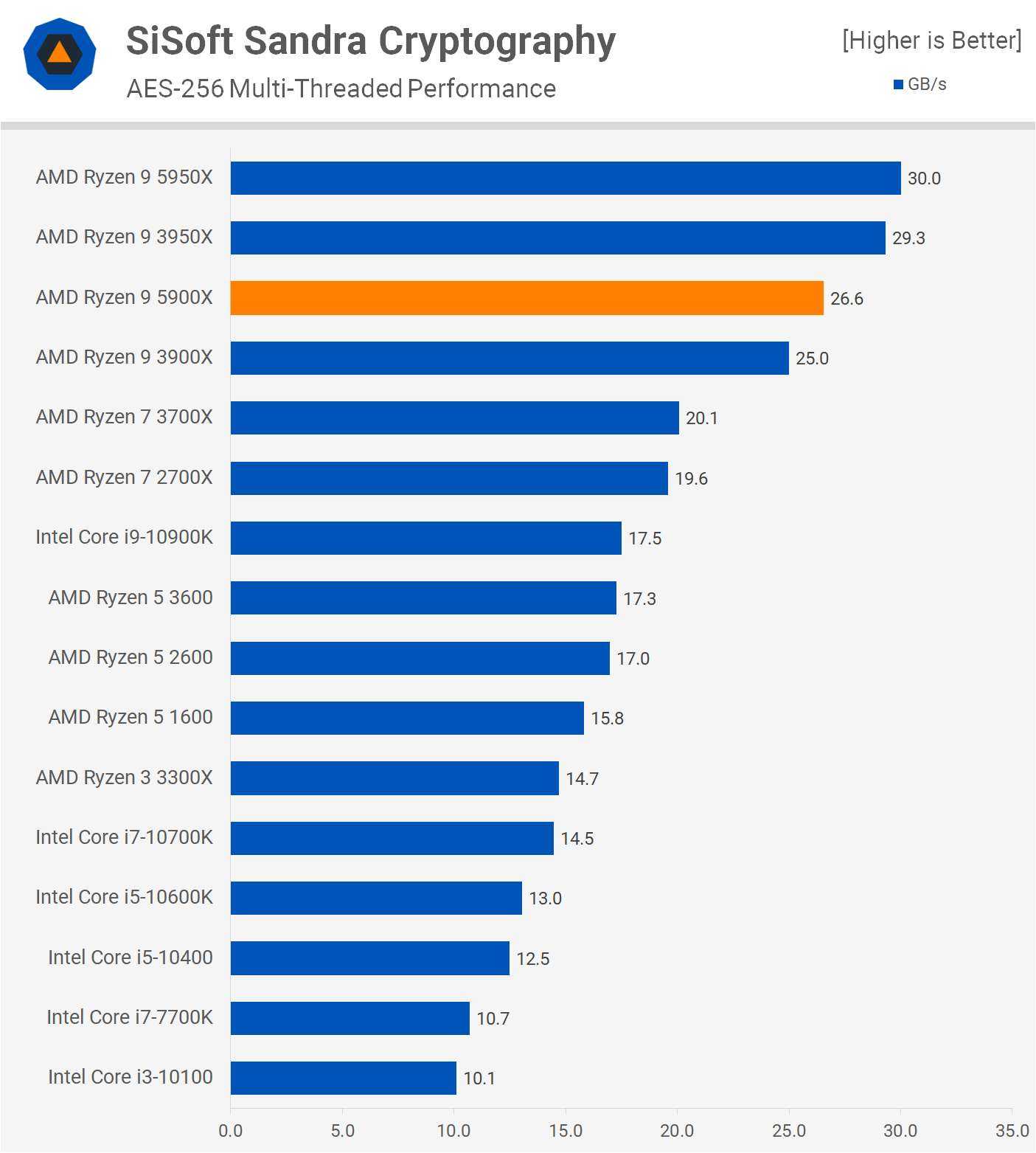 В Zen 3 производительность шифрования AES немного улучшена, и в этой области Zen 2 уже преуспел. Поэтому неудивительно, что 5900X доминирует над 10900K с огромным отрывом в 52%.