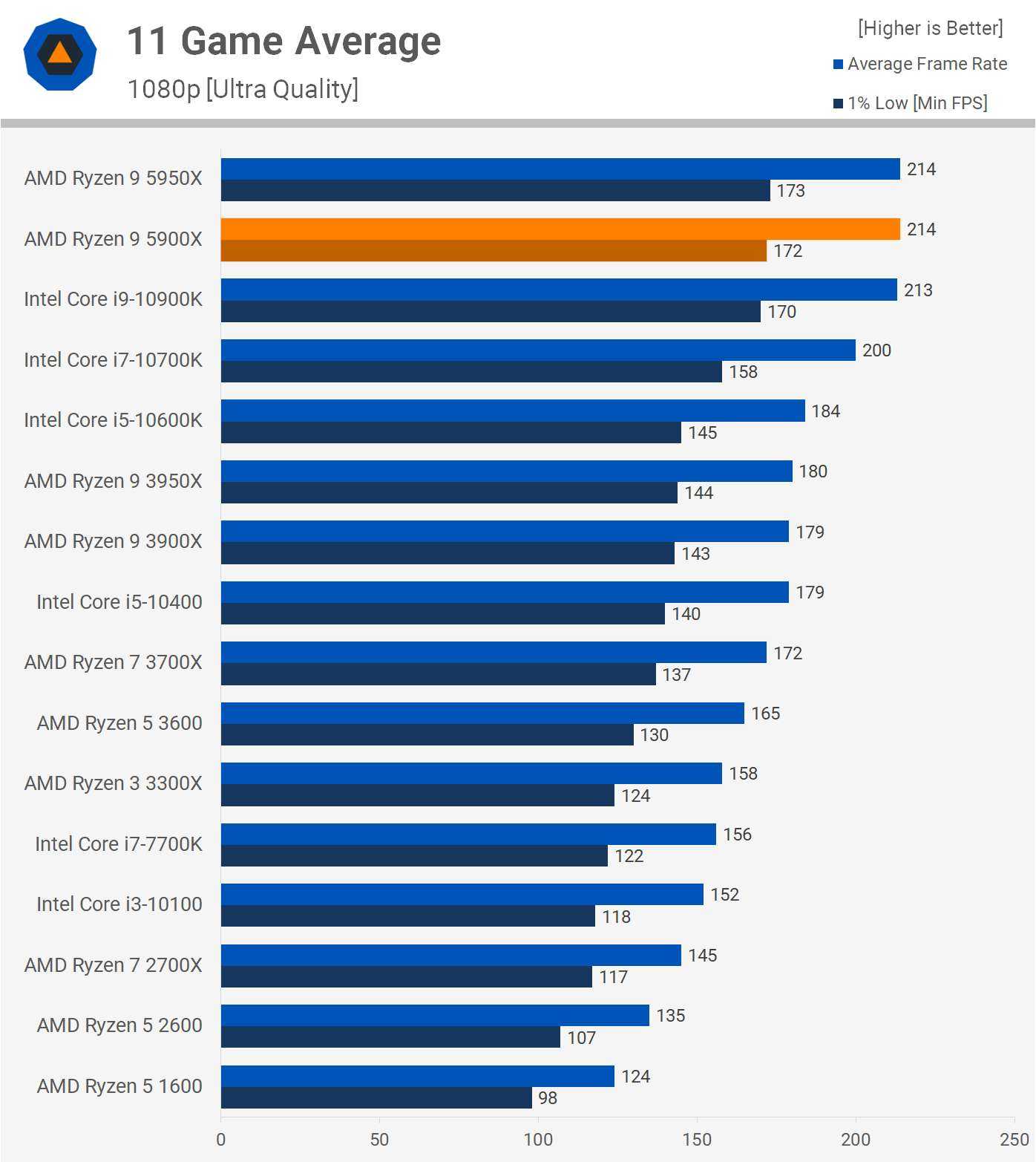 Вот средняя производительность в 11 протестированных нами играх. По большей части 5900X соответствует 5950X в играх, поэтому неудивительно, что они оба показывают одинаковое среднее значение 214 кадров в секунду.