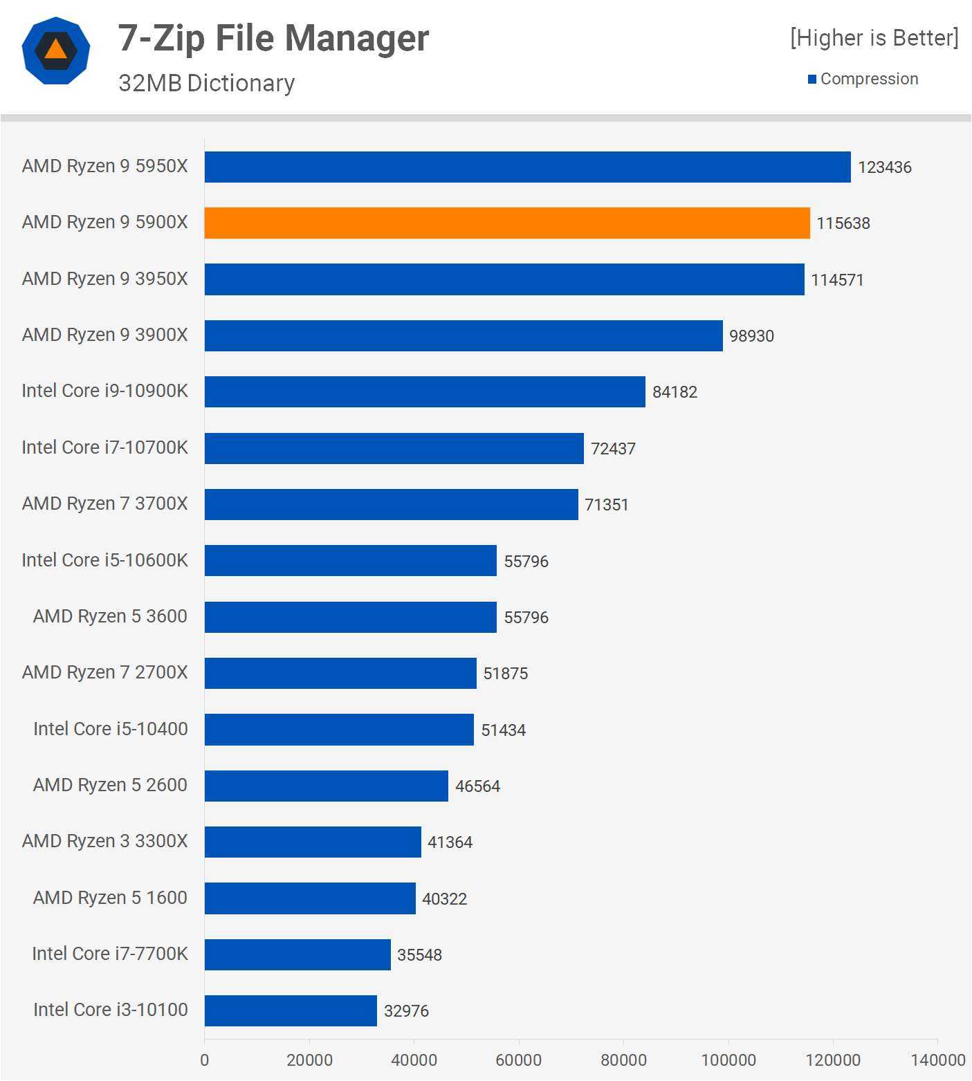 7-zip оценивает производительность сжатия, и здесь 5900X на 17% быстрее, чем его предшественник. Он также может обогнать 3950X, что делает его на 37% быстрее, чем 10900K.