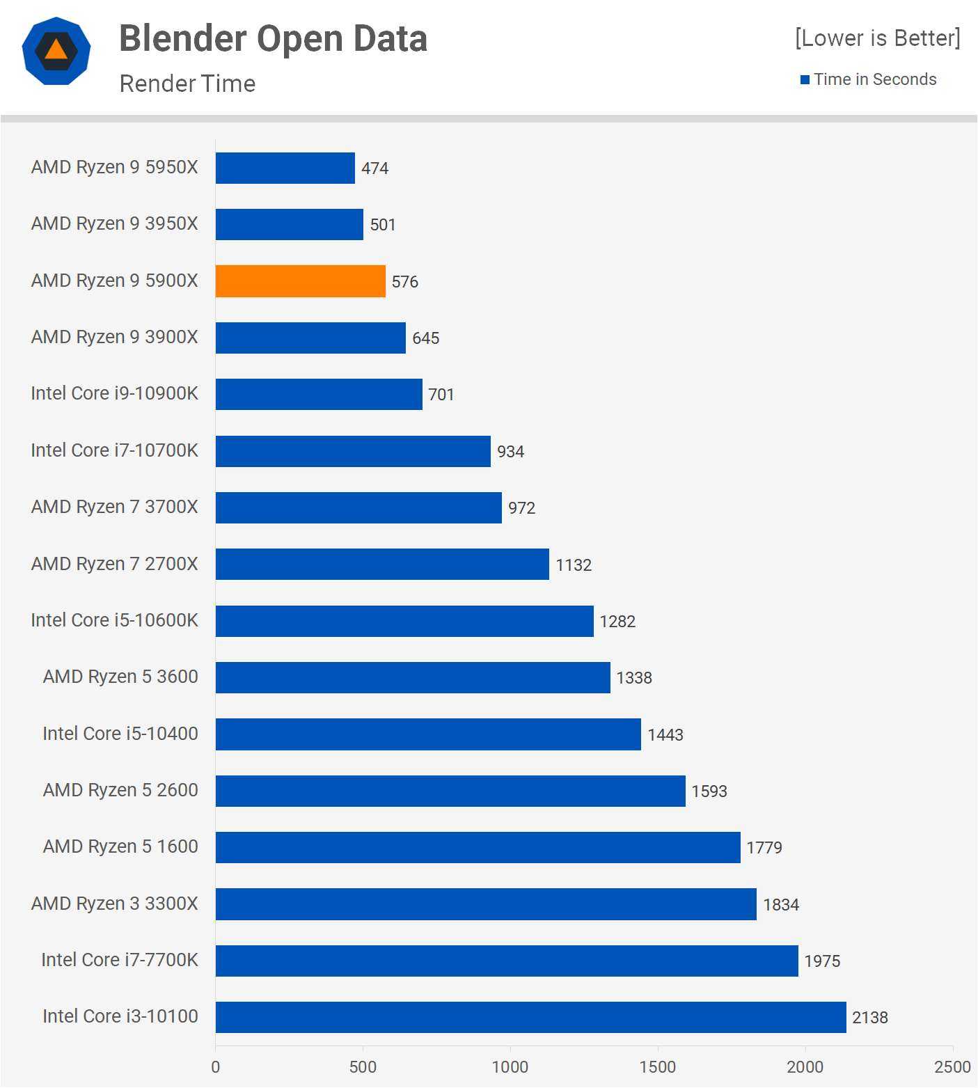 Переходя к Blender, мы наблюдаем прирост производительности 5900X на 12% по сравнению с 3900X, а это означает, что он был на 22% быстрее, чем 10900K.