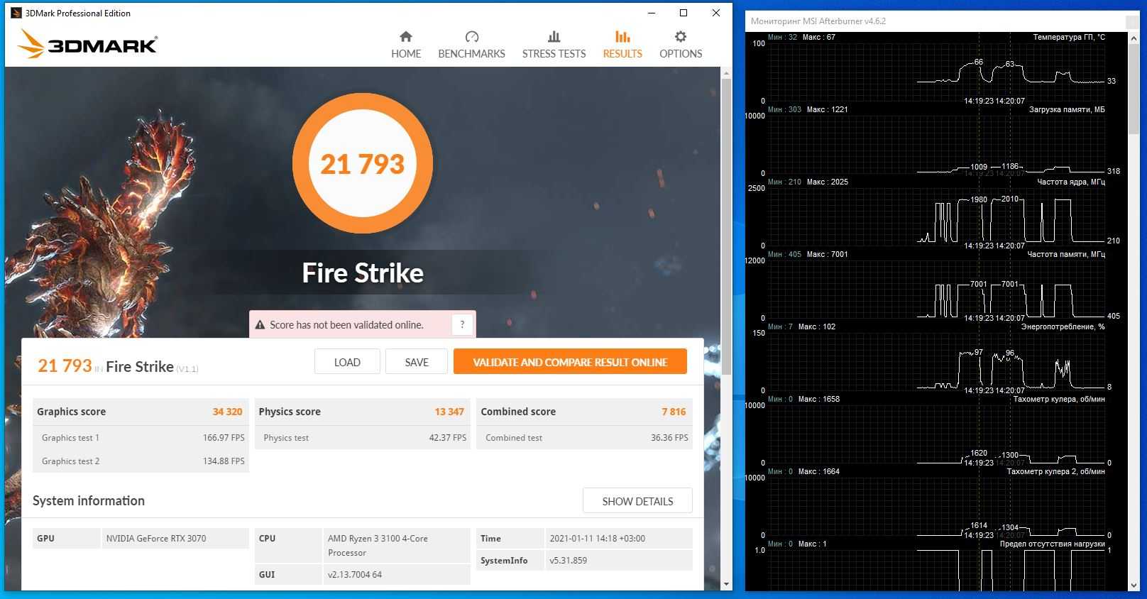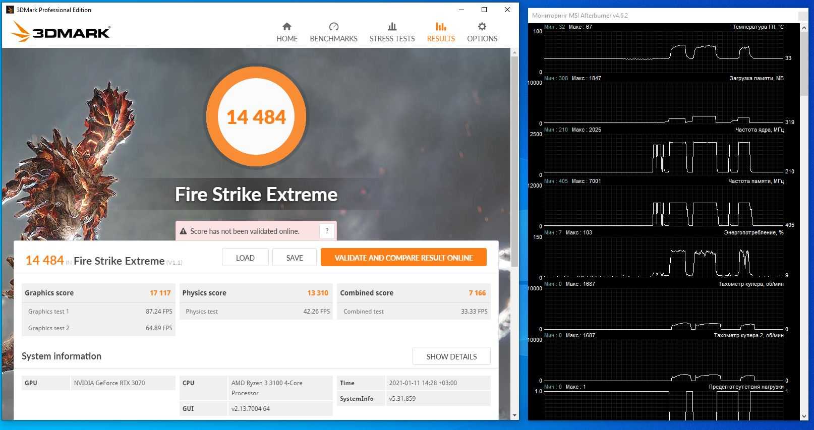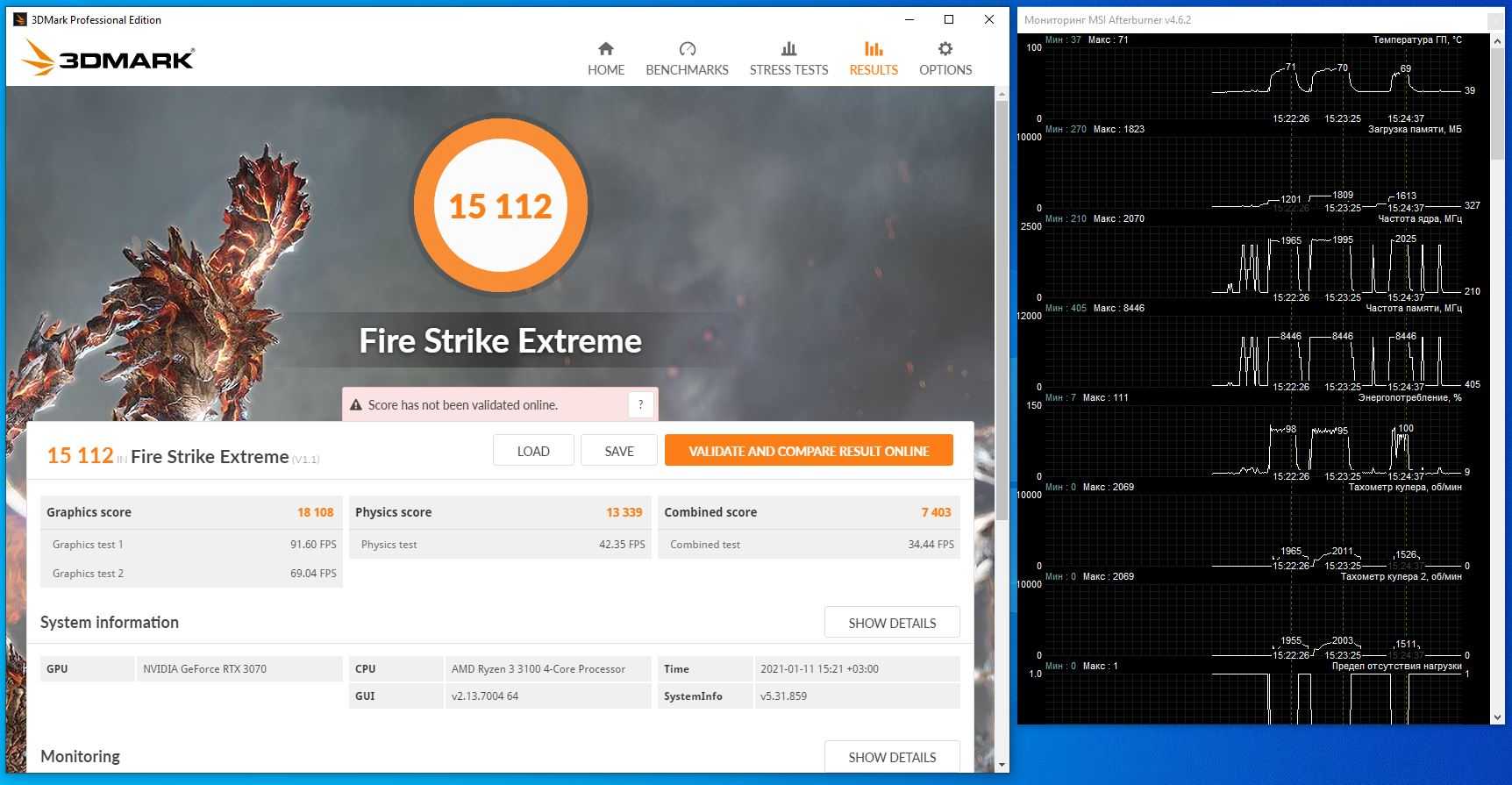 Итогом разгона стали 36 116 «попугаев» в FireStike и 18 108 в FireStike Extreme. От стока это прирост на 5,2% и 5,8% соответственно. Итого из Palit GeForce RTX 3070 GameRock OC можно выжать ещё примерно 5% от стоковых значений, а относительно референса она быстрее на те же ~5%.
