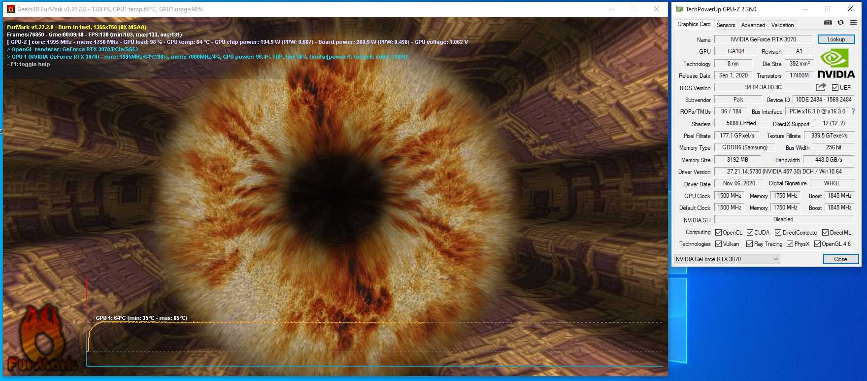Если попытаться нагреть видеокарту максимально с помощью стресс-теста Furmark Burn-in, то мы получим пиковую температуру в 74˚С для RTX 3090 GamingPro OC. Для этого видеокарта задействует лишь 55% скорости своих вентиляторов, которые разгоняются до 2130 об/мин.