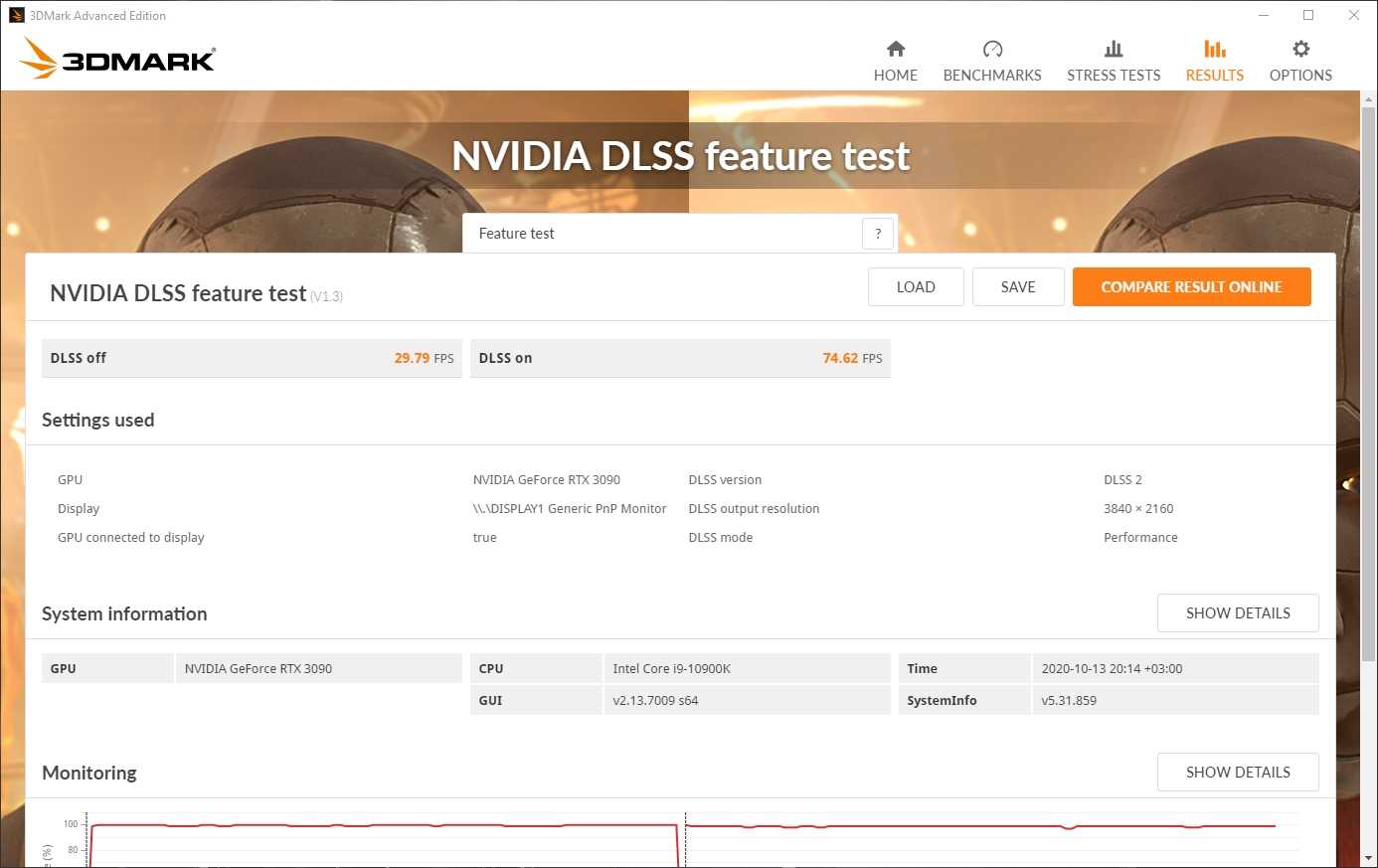 Заодно проверили с помощью 3D Mark эффективность технологии DLSS. В этой дисциплине RTX 3090 GamingPro OC продемонстрировала практически двукратный рост FPS.