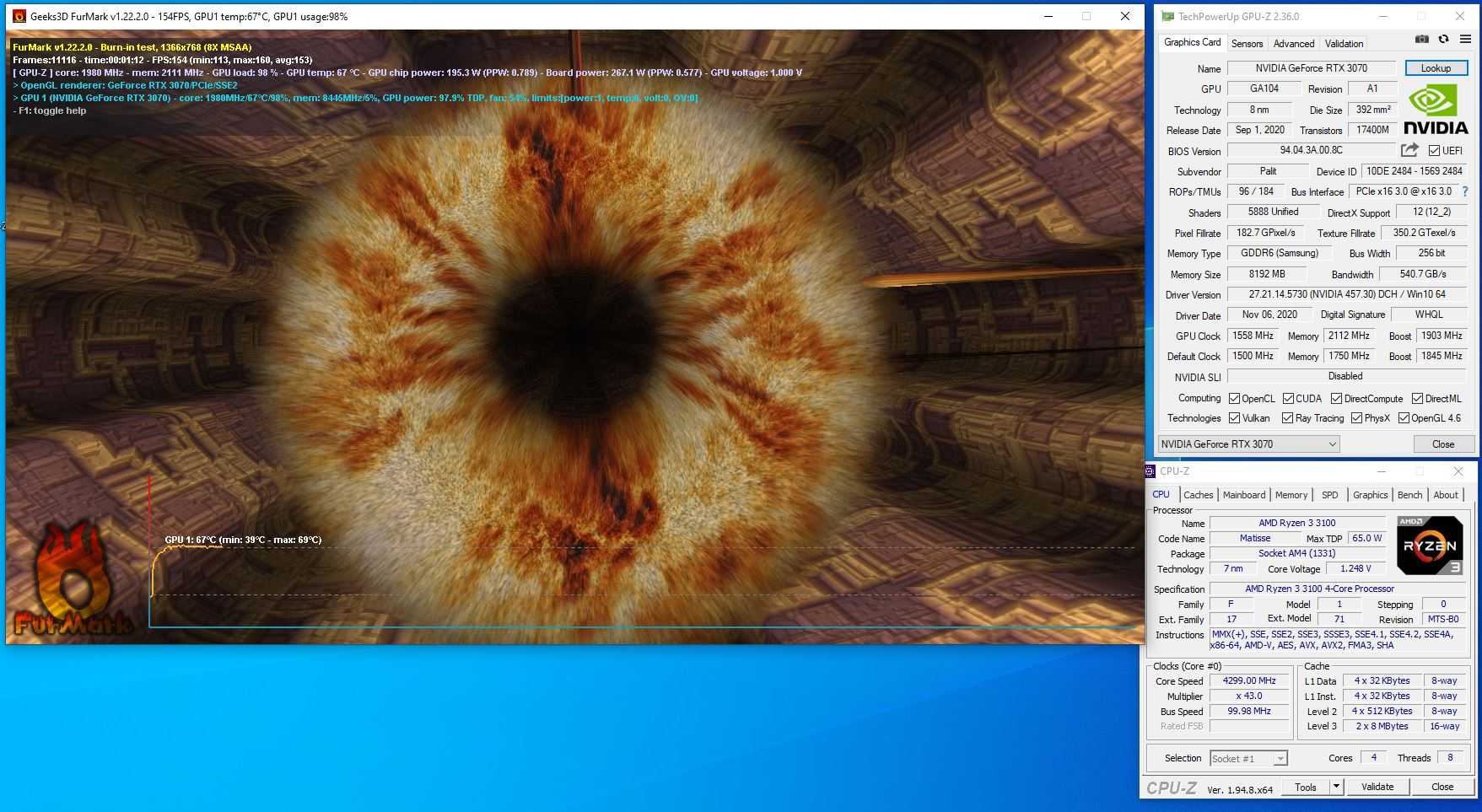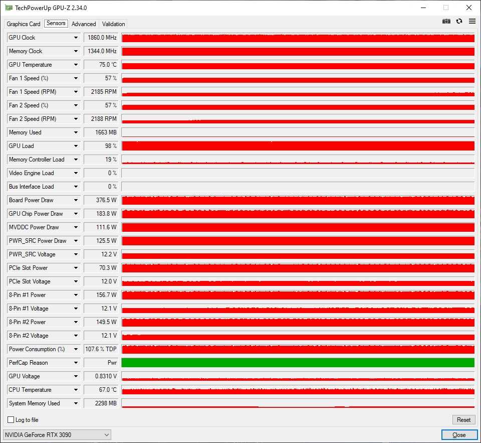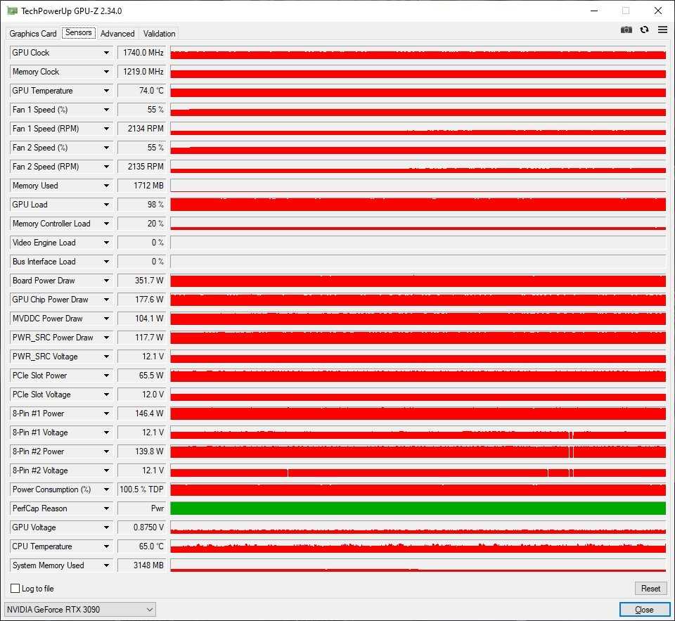 После разгона RTX 3090 GamingPro OC существенно выросла частота графического чипа, под нагрузкой Furmark Burn-in он «бустил» в районе 1860 МГц. При этом нагрев GPU составил лишь 75˚С, что больше лишь на один пункт в сравнении с эксплуатацией видеокарты без разгона. С автоматическим управлением вентиляторы системы охлаждения разогнались до 57% или 2185 об/мин.