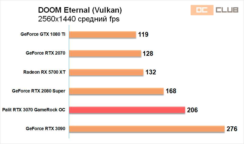 Основанная на движке id Tech 7, DOOM Eternal работает исключительно с API Vulkan. Игра великолепно оптимизирована. Стабильно высокий fps показывают все видеокарты даже на предустановке Ultra Nightmare, на которой тестирование и проводилось.