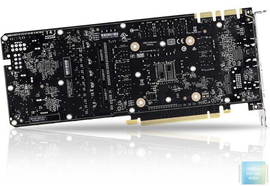 Перед нами печатная плата черного цвета с классическим расположением элементов. В центральной части расположен графический процессор вокруг которого распаяны микросхемы памяти. Немного правее расположена подсистема питания.