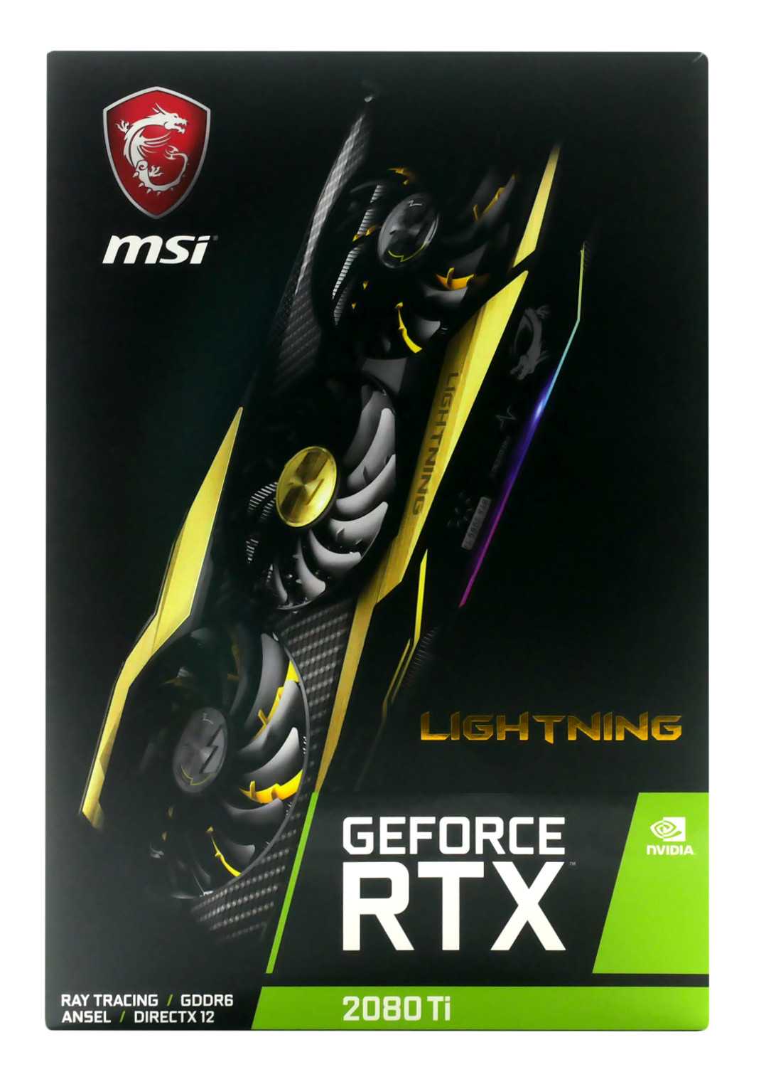 MSI GeForce RTX 2080 Ti Lightning Z поставляется в огромной упаковке с темной полиграфией и золотым очертанием видеокарты.