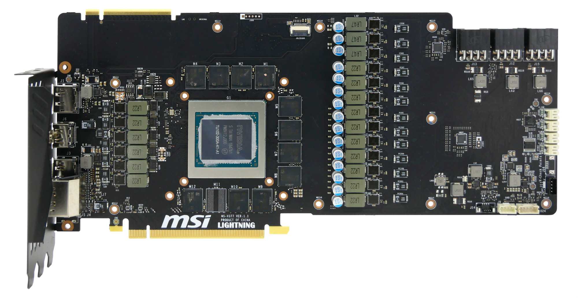 Модель MSI GeForce RTX 2080 Ti Lightning Z построена на оригинальной печатной плате черного цвета. Удаленно наблюдается сходство с референсной PCB видеокарты GeForce RTX 2080 Ti FE. Однако для закладывания большего числа возможностей инженеры увеличили число слоев печатной платы и расширили ее.
