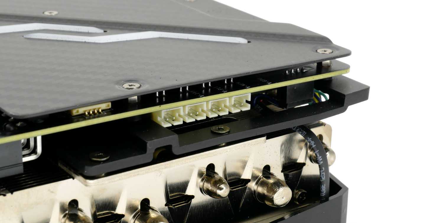 Это стало необходимым для размещения мощной цифровой подсистемы питания, насчитывающей девятнадцать фаз питания по формуле «16+3», где шестнадцать фаз отведены на графический процессор под управлением ШИМ-контроллераMP2888A, а три — для микросхем памяти GDDR6 под управлениемMP2884A. В качестве мосфетов применяютсяON SemiconductorFDMF3170 с силой тока до 70 А и рабочей температурой до 125*С.