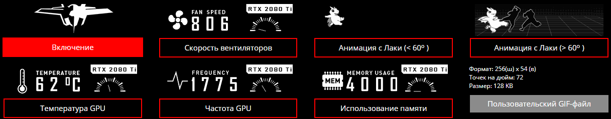 На официальной странице модели MSI GeForce RTX 2080 Ti Lightning Z можно не только познакомится с другими анимациями, но и скачать архив предложенных действий и, конечно же, загрузить в устройство свое GIF-изображение с нужными параметрами.