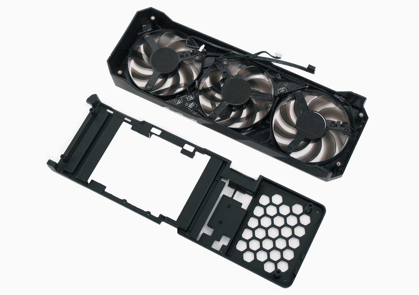 На GeForce RTX 3080 Ti GameRock OC тепло от зоны VRM и чипов памяти GDDR6X на себя забирает отдельный радиатор черного цвета. К кожуху СО крепятся три 90-мм вентилятора с полупрозрачной крыльчаткой. Технология «0 dB-tech» позволяет вентиляторам останавливаться при низкой нагрузке или полном простое графического адаптера. Стоит отметить, что в модели GeForce RTX 3080 Ti GameRock OC используются долговечные вентиляторы на двойном шарикоподшипнике.
