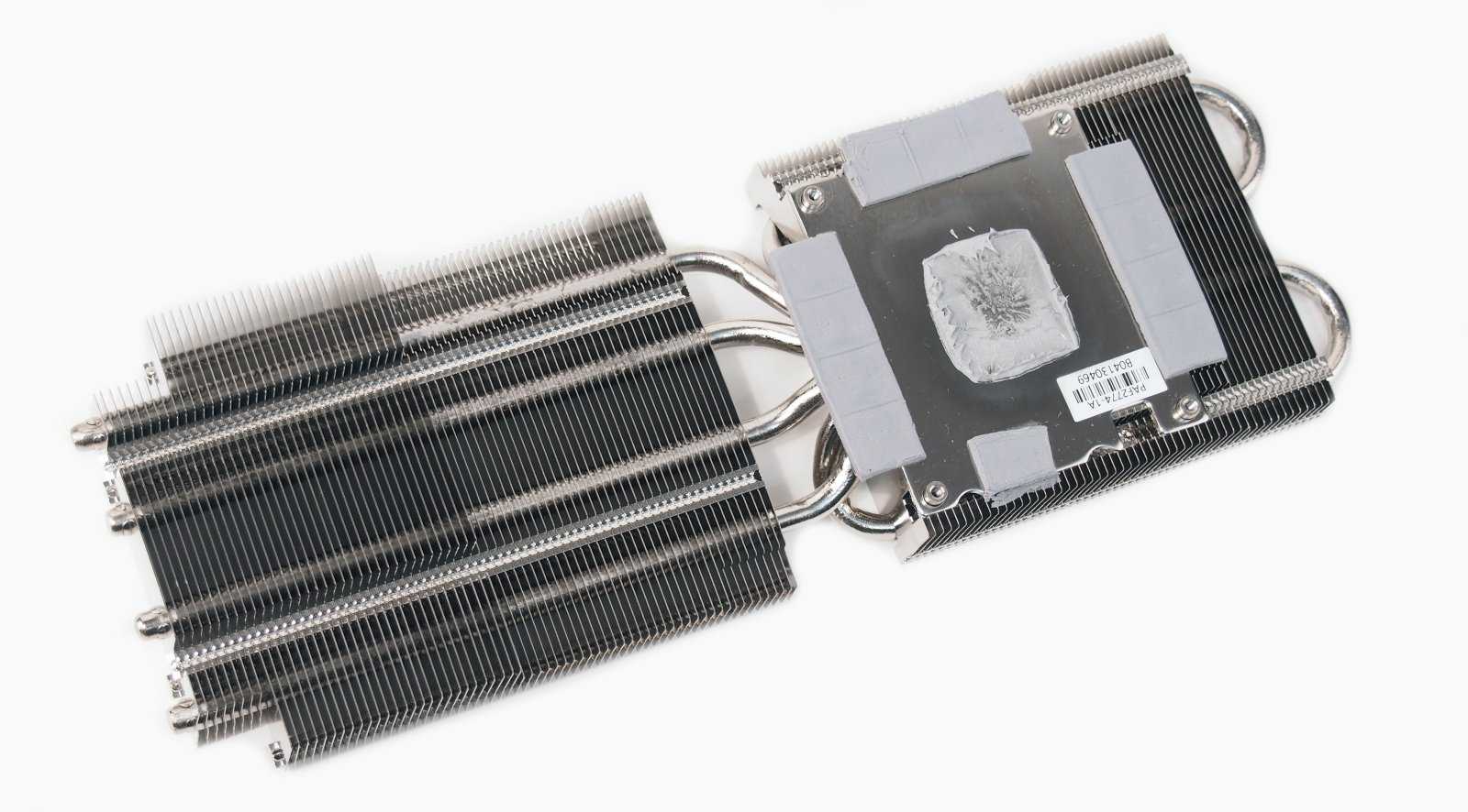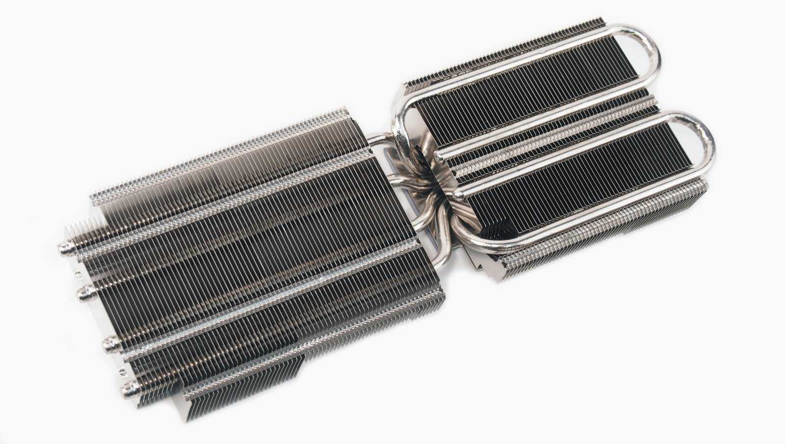 Конструкция радиатора GeForce RTX 3080 Ti GamingPro несколько упрощена в сравнении с таковым у GeForce RTX 3080 Ti GameRock OC. Количество никелированных тепловых трубок диаметром 6 мм то же — их шесть. Но распределяют отводимое тепло на секции радиатора они иначе. Лишь четыре из шести тепловых трубок «уходят» на вторую секцию с алюминиевыми пластинами, в то время как другие две в U-образной форме остаются на первой секции. При этом плотность размещения самих алюминиевых пластин примерно та же.