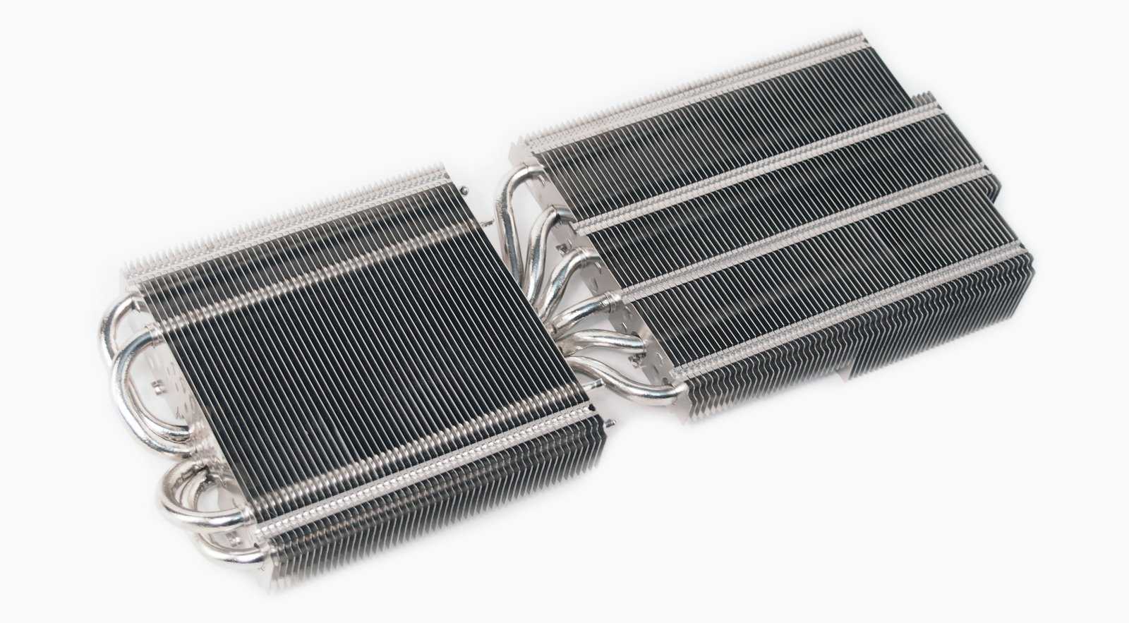 Радиатор охлаждения у GeForce RTX 3080 Ti GameRock OC двухсекционный с использованием шести никелированных тепловых трубок диаметром 6 мм. Для контакта с графическим процессором предусмотрена специальная теплосъемная пластина, качество полировки которой на высшем уровне. Конструкция построена таким образом, чтобы тепловые трубки могли быстро распределить отводимое тепло на обе секции радиатора с плотным алюминиевым оребрением.