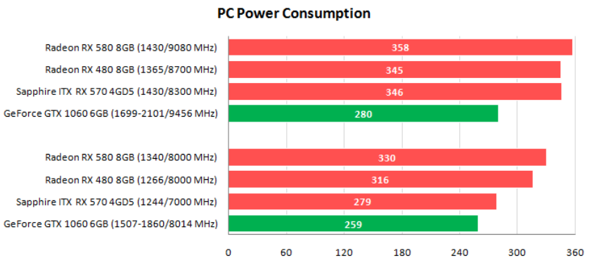 В сравнении со старшей моделью, RX 570 демонстрирует более низкое энергопотребление, однако при разгоне мощность сильно повышается, и при максимально достигнутой частоте она равна старшим образцам модельного ряда.