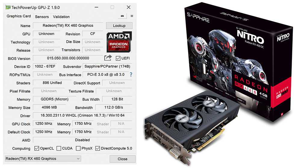 Sapphire Radeon RX 460 Nitro: все технические характеристики отображаются в программе GPU-Z.