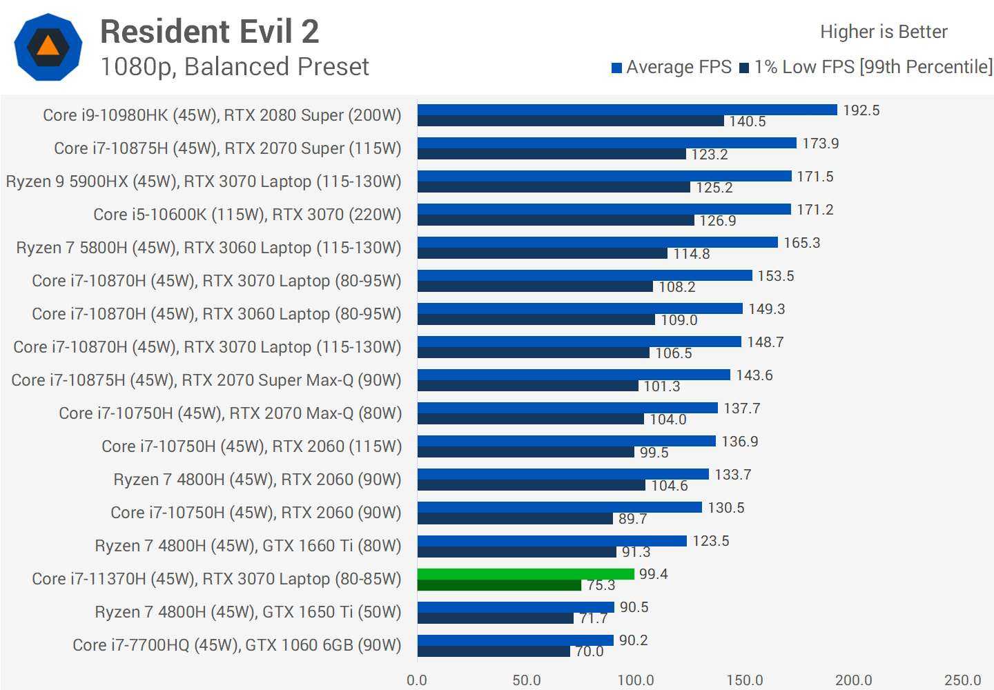 Но затем, когда мы перейдем к играм с ограничением по ЦП, ситуация полностью изменится. Здесь у нас есть Resident Evil 2 с использованием предустановки Balanced, которая в значительной степени ограничена процессором в этих системах при разрешении 1080p. Ноутбук, оснащенный восьмиядерным процессором 10870H, значительно быстрее, мы говорим на 54% быстрее, что является безумным запасом для любого оборудования с ограниченным процессором. К счастью, это худший сценарий для TUF F15 и 11370H, так что давайте продолжим.