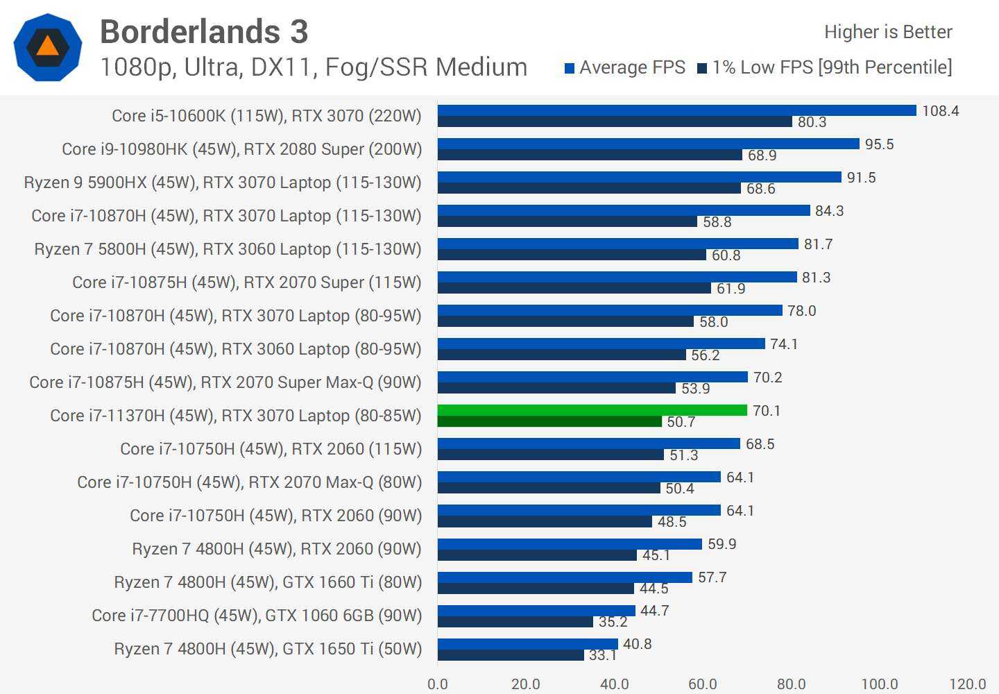 В Borderlands 3 мы чувствуем некоторое облегчение. Хотя конфигурация 10870H по-прежнему быстрее, теперь она всего на 11% впереди, что является гораздо более управляемой маржой и ниже, чем некоторые из наблюдаемых нами дельт производительности. Но он все равно медленнее, чем довольно популярная конфигурация ноутбука с новым RTX 3070.