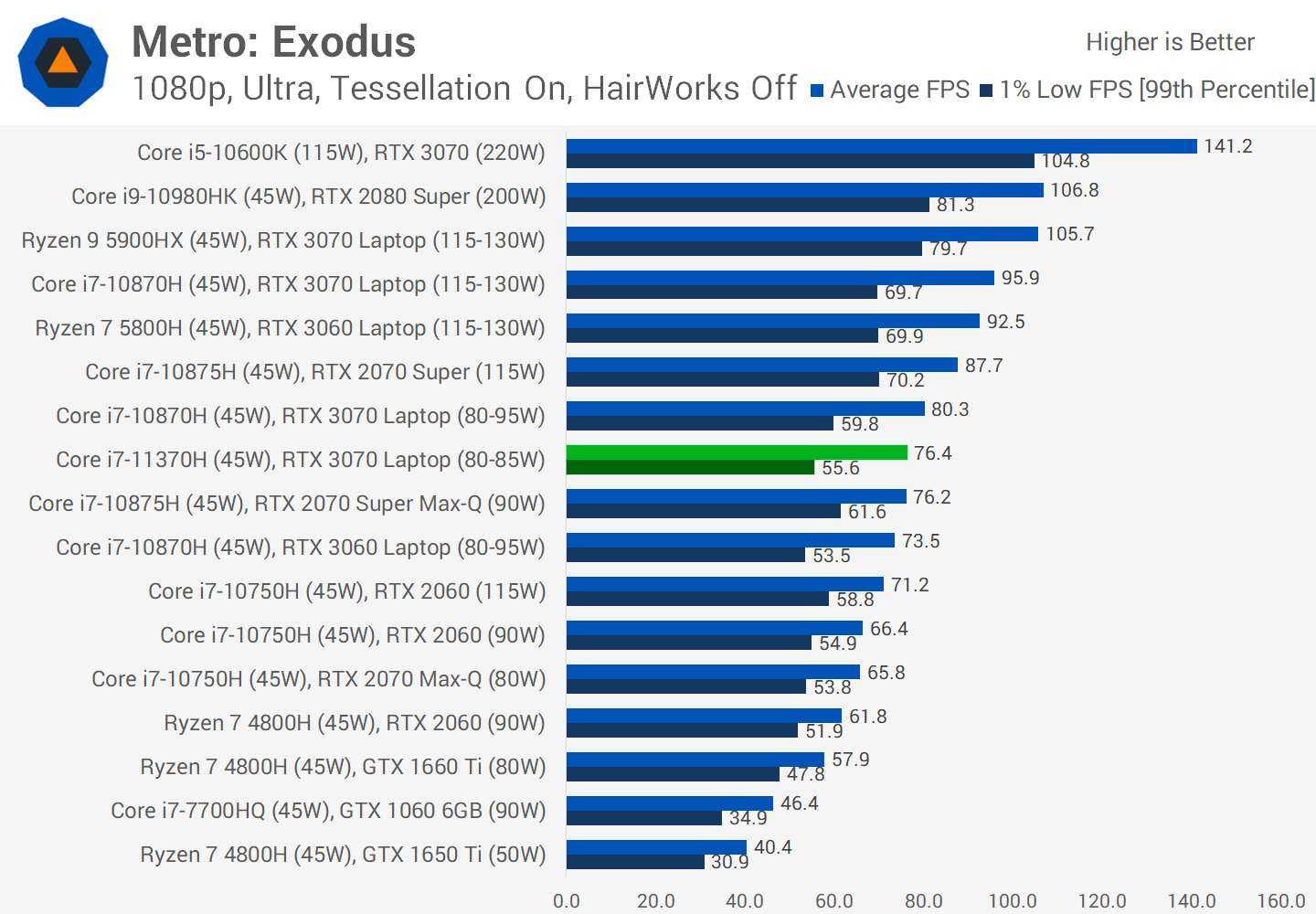 Сначала я хочу начать с некоторых игр с ограничением на GPU, чтобы разогреть нас. Одна из них — Dirt 5. Здесь мы видим, что с RTX 3070 системы 11370H и 10870H работают примерно так же, как и следовало ожидать. Еще одна игра, в которой мы видим, что это происходит, — Metro Exodus, система предыдущего поколения немного быстрее, но в целом имеет примерно такую же производительность.