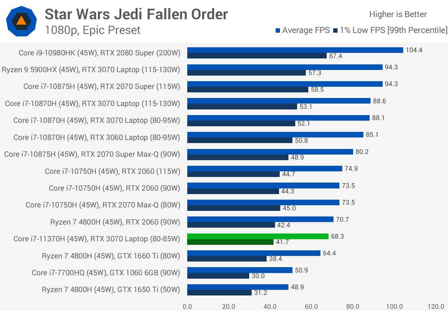 В Star Wars Jedi Fallen Order мы все еще видим большое расхождение в производительности между конфигурациями 10870H и 11370H, но здесь мы говорим только о разнице в 29%, что выглядит намного лучше, чем в предыдущем графике. Это все еще большая разница, но в такой игре с ограниченным процессором, как эта, разница в производительности не так уж далека от того, что мы видели в некоторых тестах производительности, таких как компиляция Blender или Chromium. Когда вы упаковываете такой мощный графический процессор, наличие дополнительного места для процессора имеет большое значение.