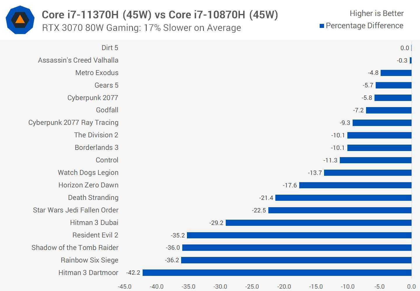 Далее у нас есть игровые тесты. Здесь лучше всего сравнивать Core i7-11370H и Core i7-10870H с одним и тем же графическим процессором RTX 3070 80 Вт. Оба этих процессора используются в этой первой волне обновленных игровых ноутбуков серии RTX 30, поэтому мы сразу же рассмотрим, как они складываются.