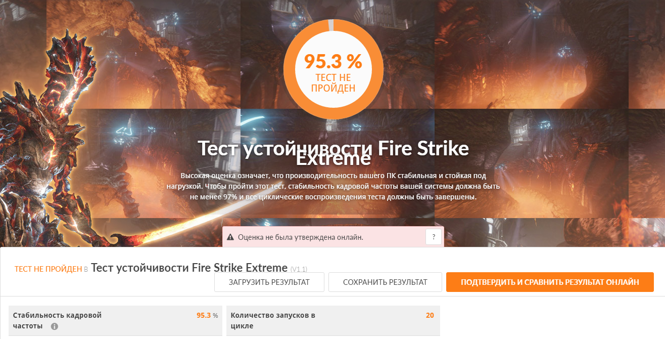 Тест устойчивости 3DMark Fire Strike Extreme не пройден, итоговая оценка 95,3%, что связано с характерным снижением тактовой частоты в угоду TDP и температуры.