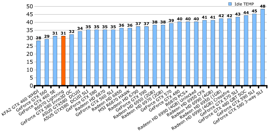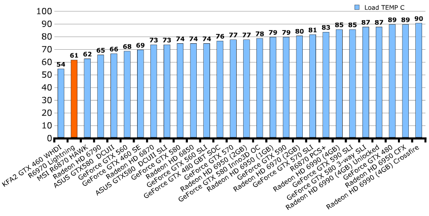 Ну надо же — рабочая температура оказалась на один градус ниже, чем у менее горячей карточки HD 6870 HAWK, что снабжена такой же системой охлаждения (Twin Frozr III). Как такое может быть?