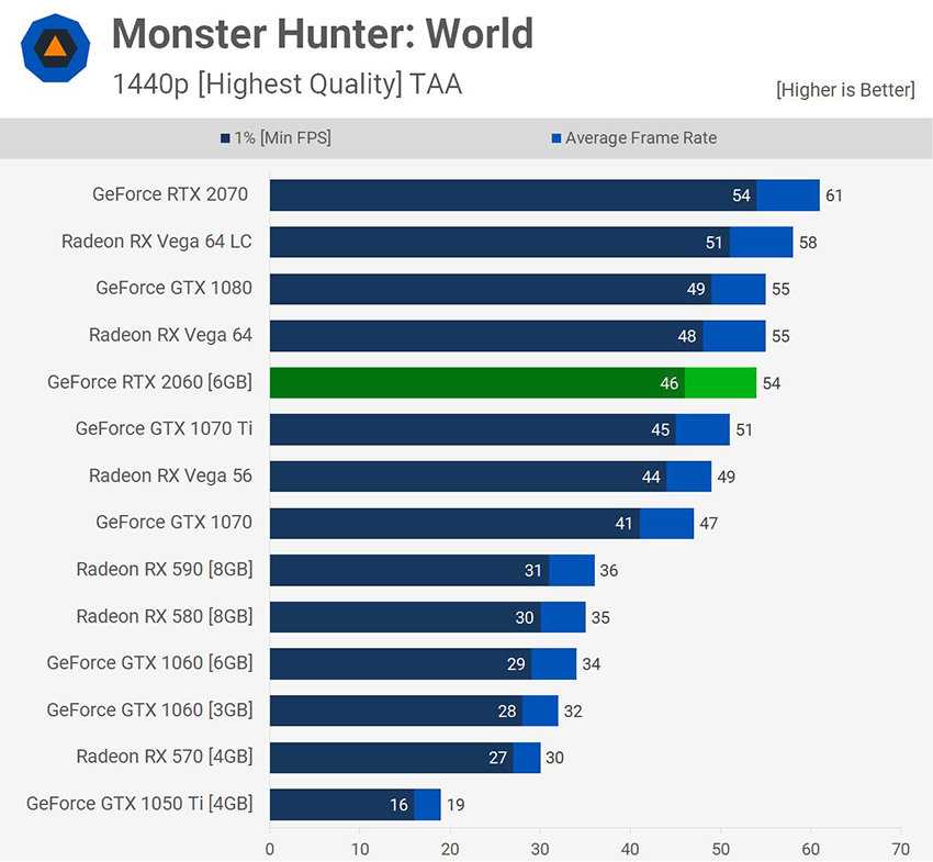 Monster Hunter World с разрешением 1440p на RTX 2060 идет достаточно хорошо. С максимальными графическими настройками мы получаем в среднем 54 fps, то есть 2060 здесь слегка медленнее, чем Vega 64 и GTX 1080. При этом она в среднем на 4-5 fps быстрее GTX 1070 Ti и Vega 56. Кроме того, здесь она только на 11% медленнее RTX 2070.