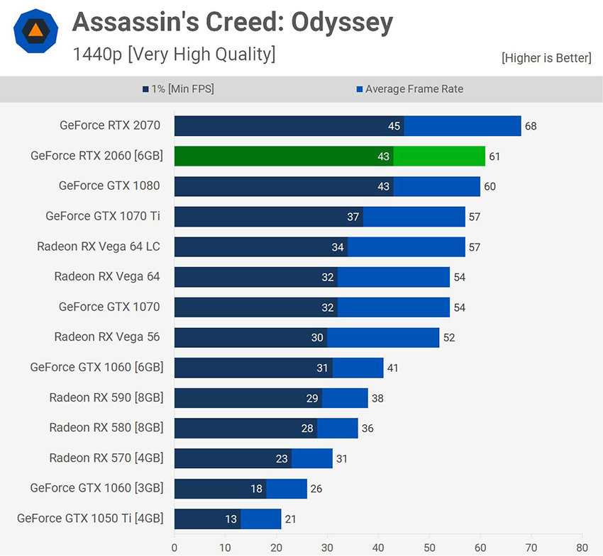 В Assassin’s Creed: Odyssey карта RTX 2060 снова догоняет GTX 1080, оказывается на 7% быстрее GTX 1070 Ti и примерно на 10% медленнее RTX 2070. И также следует отметить, что она была на 17% быстрее карты Vega 56.