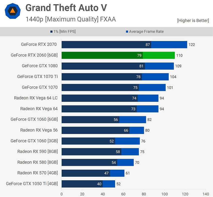 В Grand Theft Auto V получились очень интересные результаты. Карта RTX 2060 смогла почти догнать GTX 1080 и была на 6% быстрее GTX 1070 Ti. И снова – эта карта оказалась здесь всего на 10% медленнее RTX 2070, что, по нашему мнению, делает покупку карты RTX 2070 за $500 довольно бессмысленной.