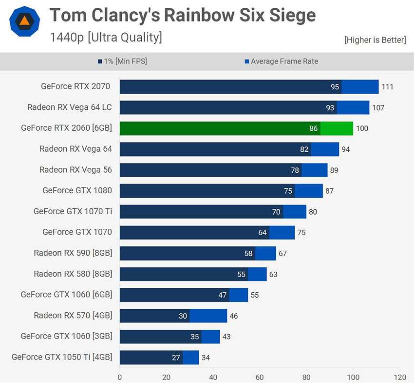 Сравнение RTX 2060 с показывает, что в среднем новая карта работает на 4% быстрее, но в шести случаях она оказалась примерно на столько же медленнее. Так что на данный момент видеокарты Turing среднего уровня имеют выраженное преимущество перед картами Pascal только в одной игре – Rainbow Six Siege, но нужно будет понаблюдать за этой тенденцией в следующих выпусках игры.