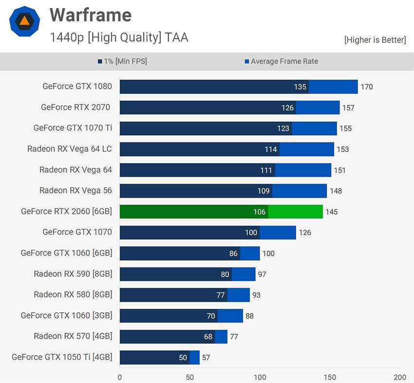 В игре Warframe новые видеокарты с архитектурой Turing не превосходят своих предшественников с архитектурой Pascal. Например, RTX 2070 оказалась на 8% медленнее GTX 1080, а RTX 2060 – на 6% медленнее GTX 1070 Ti и на 2% медленнее Vega 56.