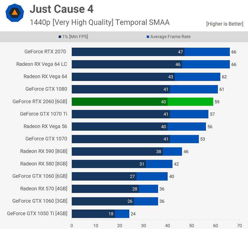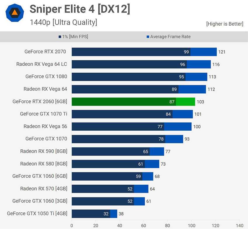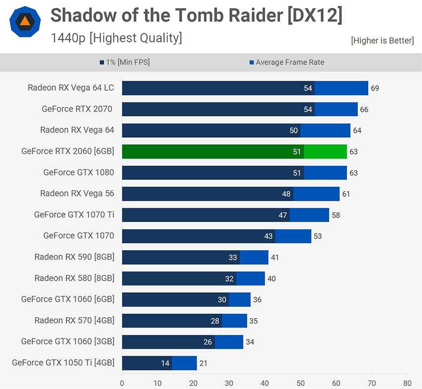 Непосредственное сравнение результатов видеокарт RTX 2060 и RTX 2070 показывает, что в худшем случае RTX 2060 оказывается на 16% медленнее. В то же время в ряде игр разница составляет менее 10%, и общий вывод таков: на разрешении 1440p карта RTX 2060 в среднем всего на 11% медленнее RTX 2070. Удивительно, зачем платить на 30% больше за видеокарту, которая даже не на 15% быстрее.