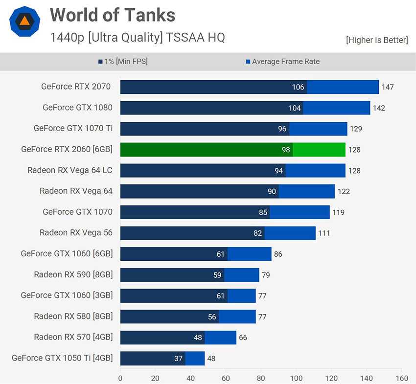И последняя игра, которую мы рассмотрим, – World of Tanks, где RTX 2060 оказалась на одном уровне с Vega 64 Liquid и GTX 1070 Ti. Карта RTX 2060 была на 13% медленнее 2070, но на 15% быстрее Vega 56.