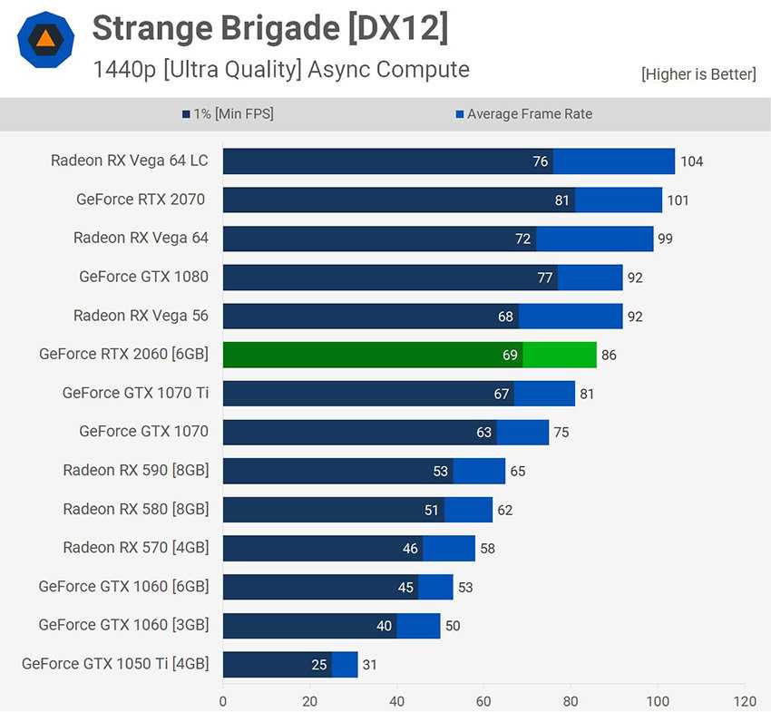 Переходим к Strange Brigade. RTX 2060 снова показала хороший результат – в среднем 86 fps, хотя это на 15% медленнее в сравнении с RTX 2070. Она здесь также оказалась на 7% медленнее Vega 56, что не очень удивительно, поскольку эта игра традиционно хорошо идет на «железе» AMD. Но все-таки карта RTX 2060 превзошла GTX 1070 Ti и в целом продемонстрировала очень приличную производительность.