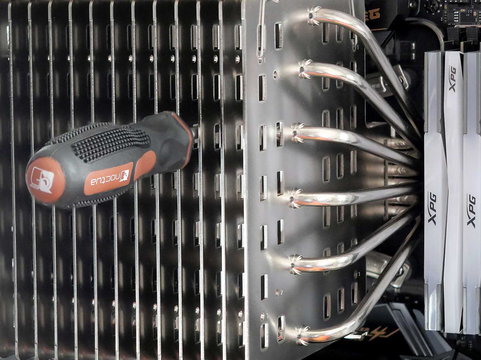 К собранным креплениям кулер прикручивается двумя подпружиненными винтами, закрепленными на его основании. Для этого потребуется воспользоваться комплектной отвёрткой, чтобы дотянуться до головок винтов через пластины. Они попадают в пробел между третьей и четвертой пластиной справа.