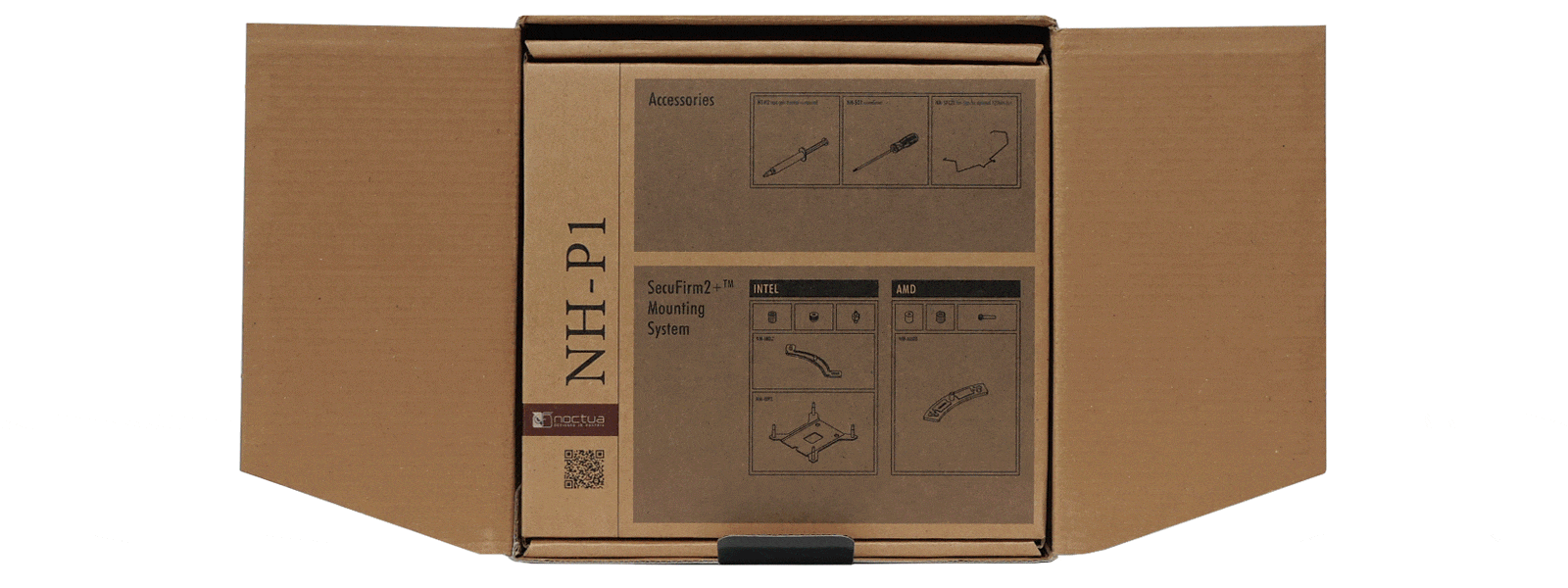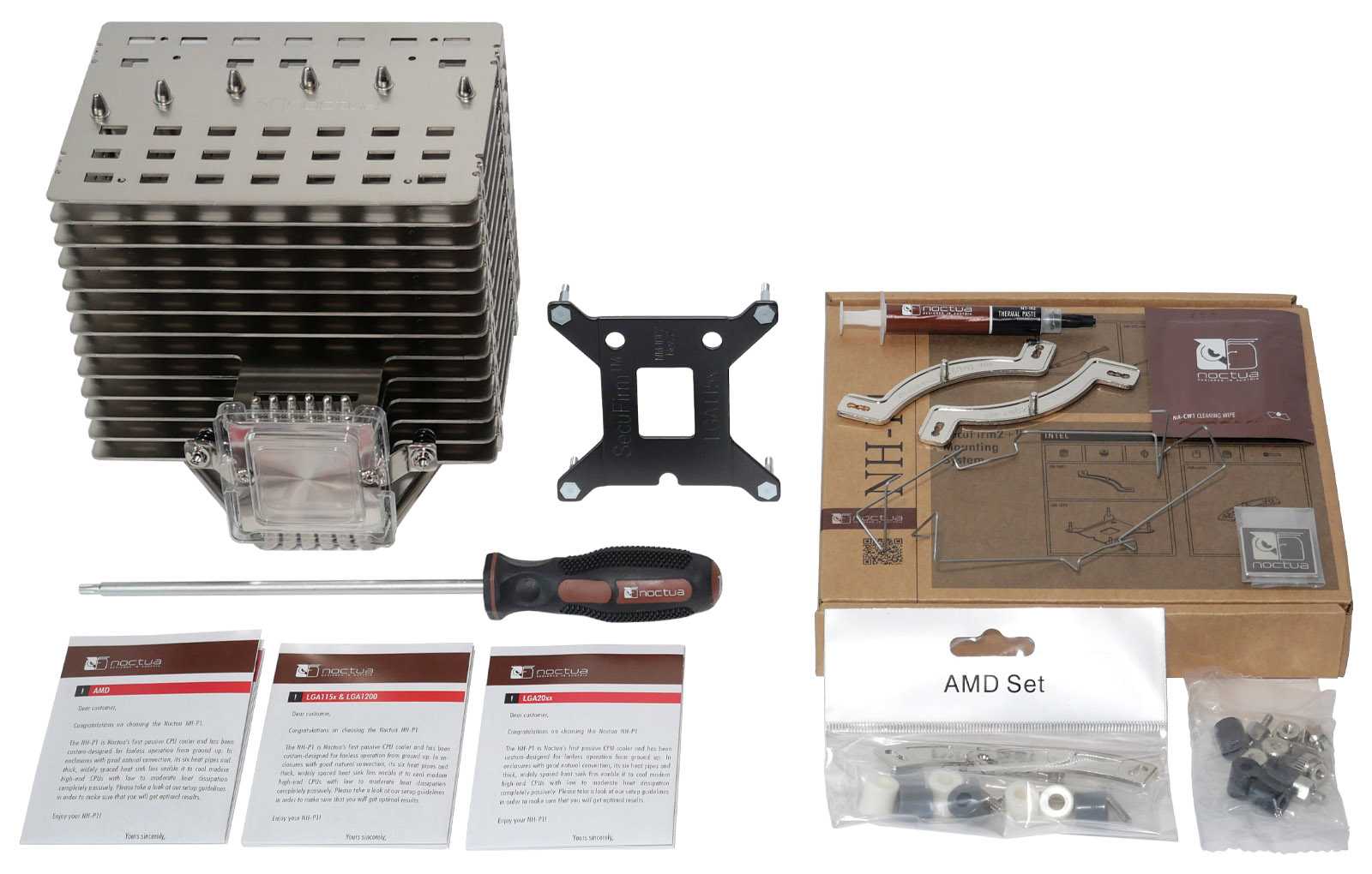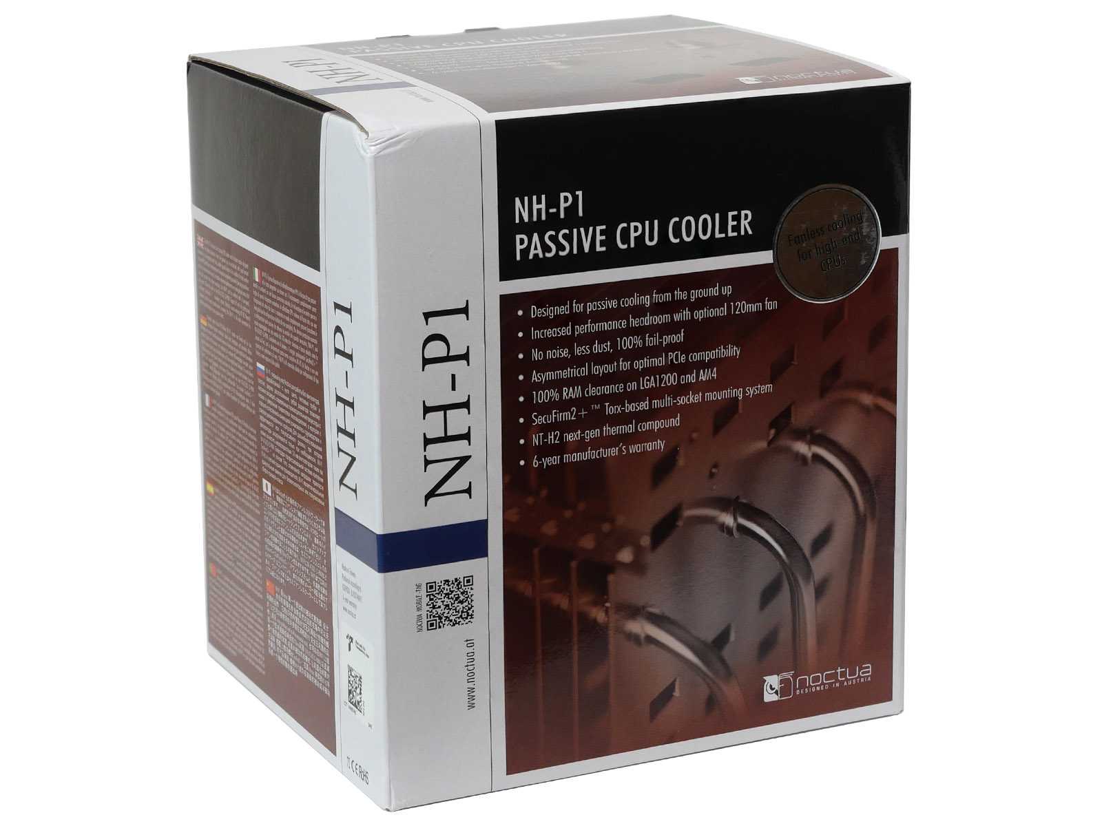 Кулер Noctua NH-P1 продаётся в презентабельно оформленной картонной коробке размером 195 x 191 x 225 мм с привычным для устройств от Noctua дизайном. На боковых гранях упаковки подробно расписаны характеристики и особенности данной модели. Преимущественно это выполнено на английском языке, но вставка с кратким русским описанием также сделана. Вес брутто — чуть меньше 2 кг.
