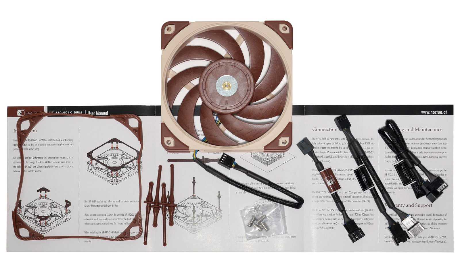Вентилятор Noctua NF-A12x25 LS-PWM, рекомендуемый для совместного использования с кулером, но приобретаемый отдельно, также отлично укомплектован. К нему прилагаются: руководство пользователя, набор силиконовых креплений NA-AV2 и рамка NA-AVG1, металлические винты, удлинитель питания вентилятора NA-EC1 длиной 30 см, Y-образный разветвитель NA-YC1 для синхронного включения двух вентиляторов и L.N.A.-адаптер понижения оборотов NA-RC8.