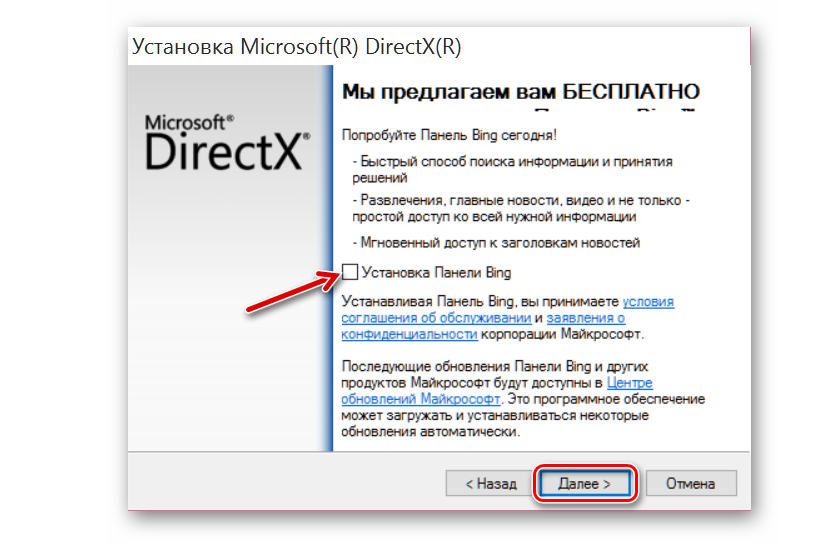 Вам ненавязчиво предложат установить панель Bing. Чтобы избежать этой участи, снимите галочку и клацните «Далее».