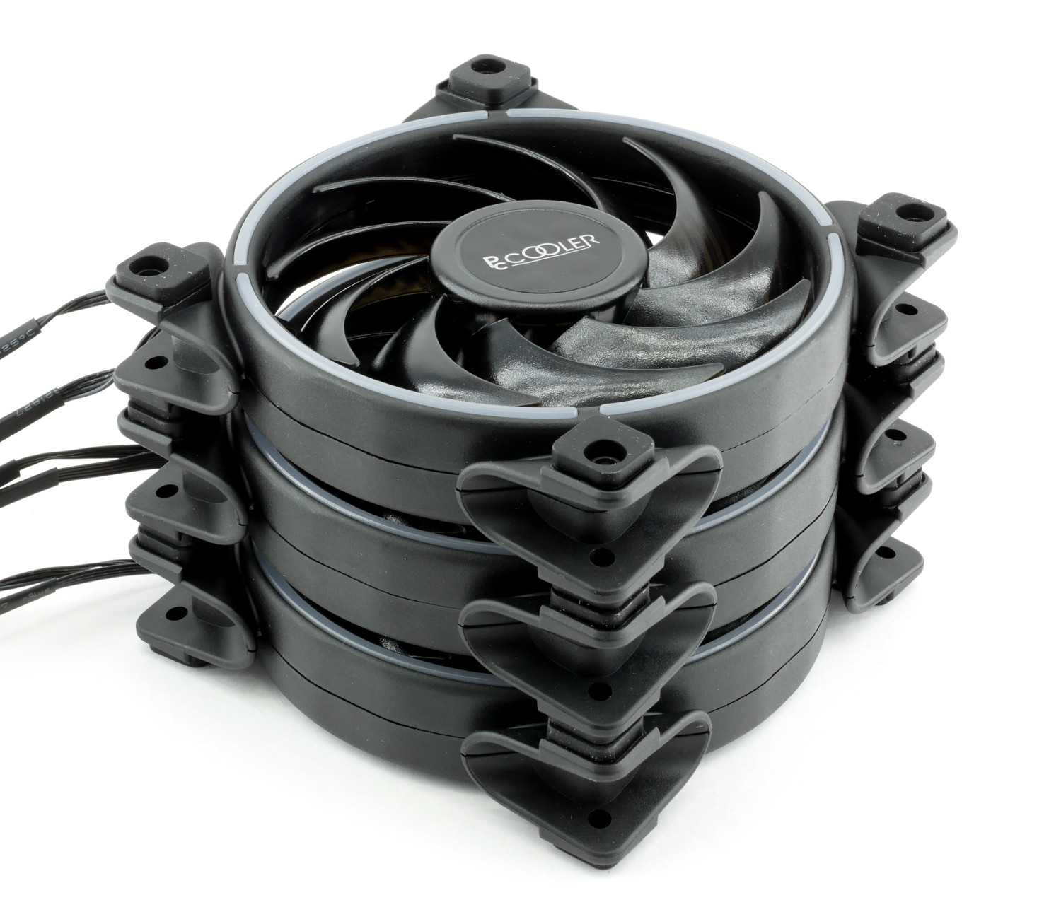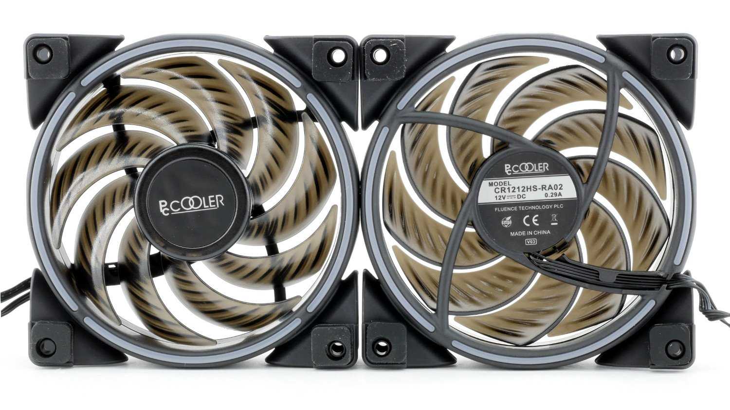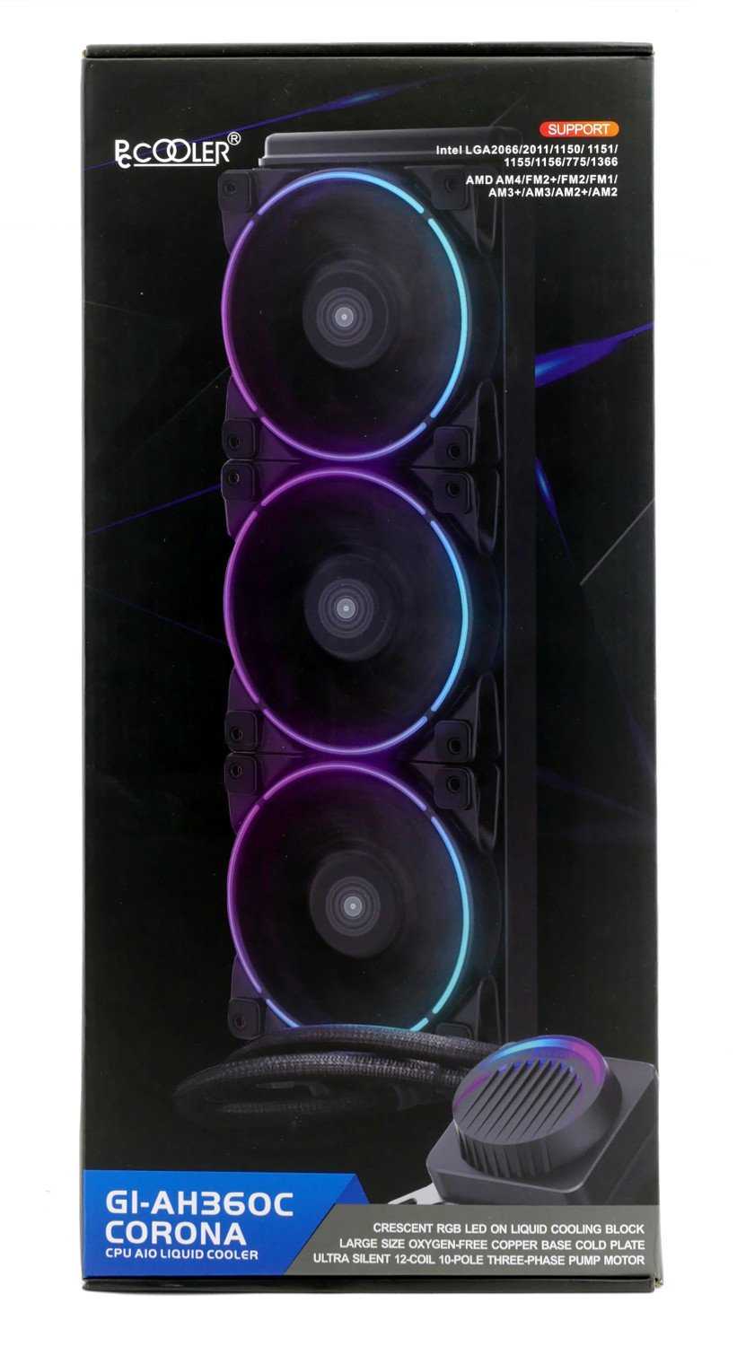 PCCooler GI-AH360C Corona оснащена тремя фирменными вентиляторами PCCooler c характерной круглой формой корпуса с RGB подсветкой и прорезиненными «ушками» для погашения вибрации. От каждой вертушки идут два провода с ШИМ-управлением 4-pin и RGB 3-pin.