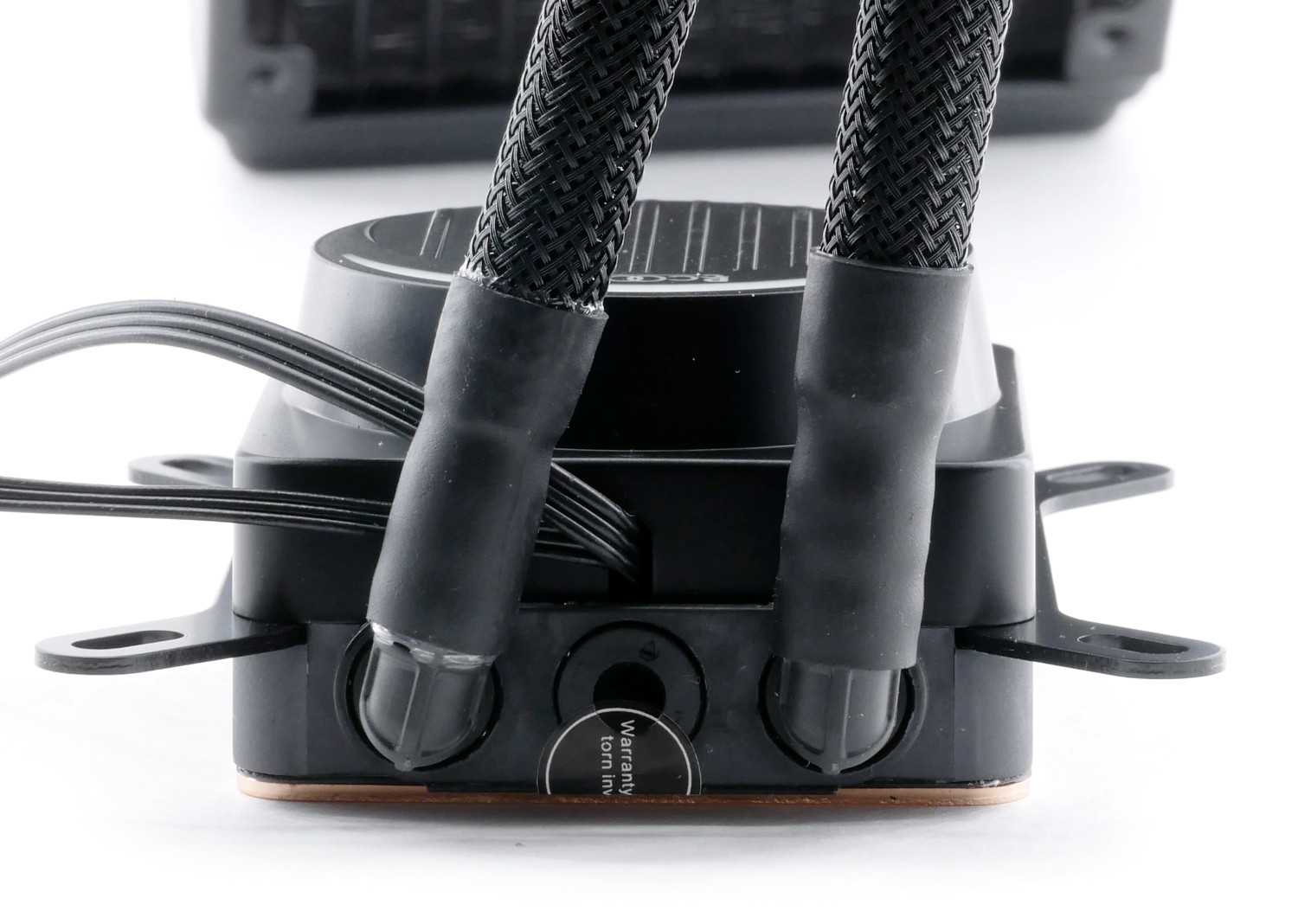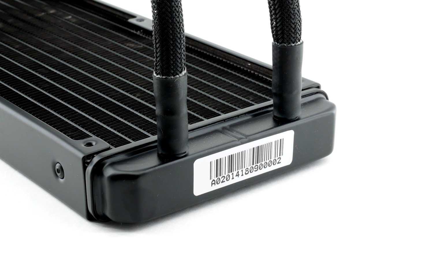 На PCCooler GI-AH360C Corona применяются несъемный тип фитингов «елка», которые обжаты резиновыми шлангами. Здесь же отмечаем информационную наклейку, но производитель отметил только идентификатор модели.
