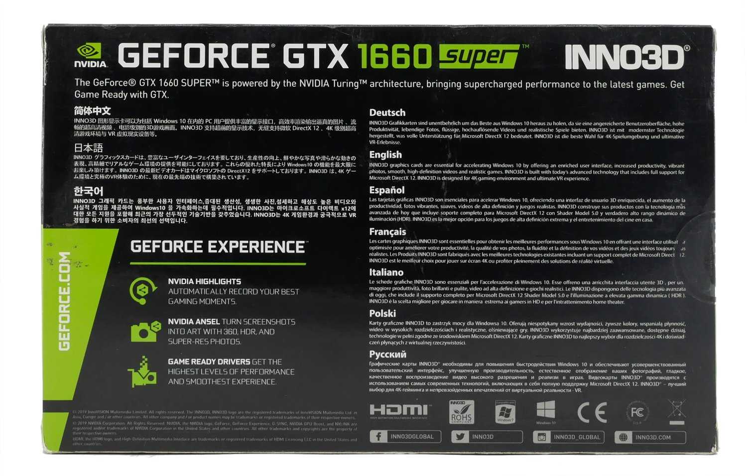 Упаковка INNO3D GeForce GTX 1660 Super Twin X2 OC RGB отличается компактными габаритами с оригинальной полиграфией производителя в виде пересечений темного фона и серого перекрестия. Отдельный стикер приводит небольшое изображение видеокарты.