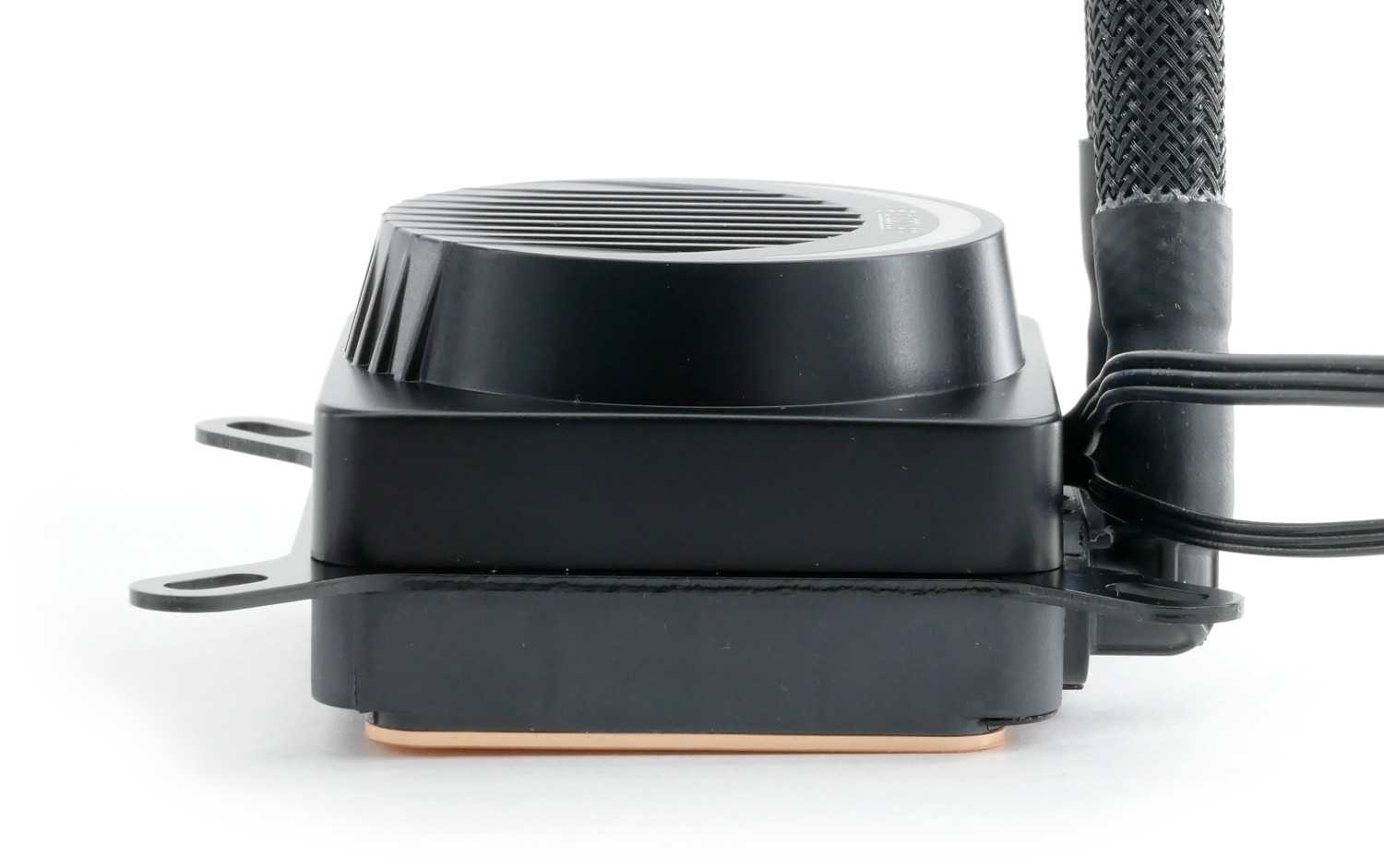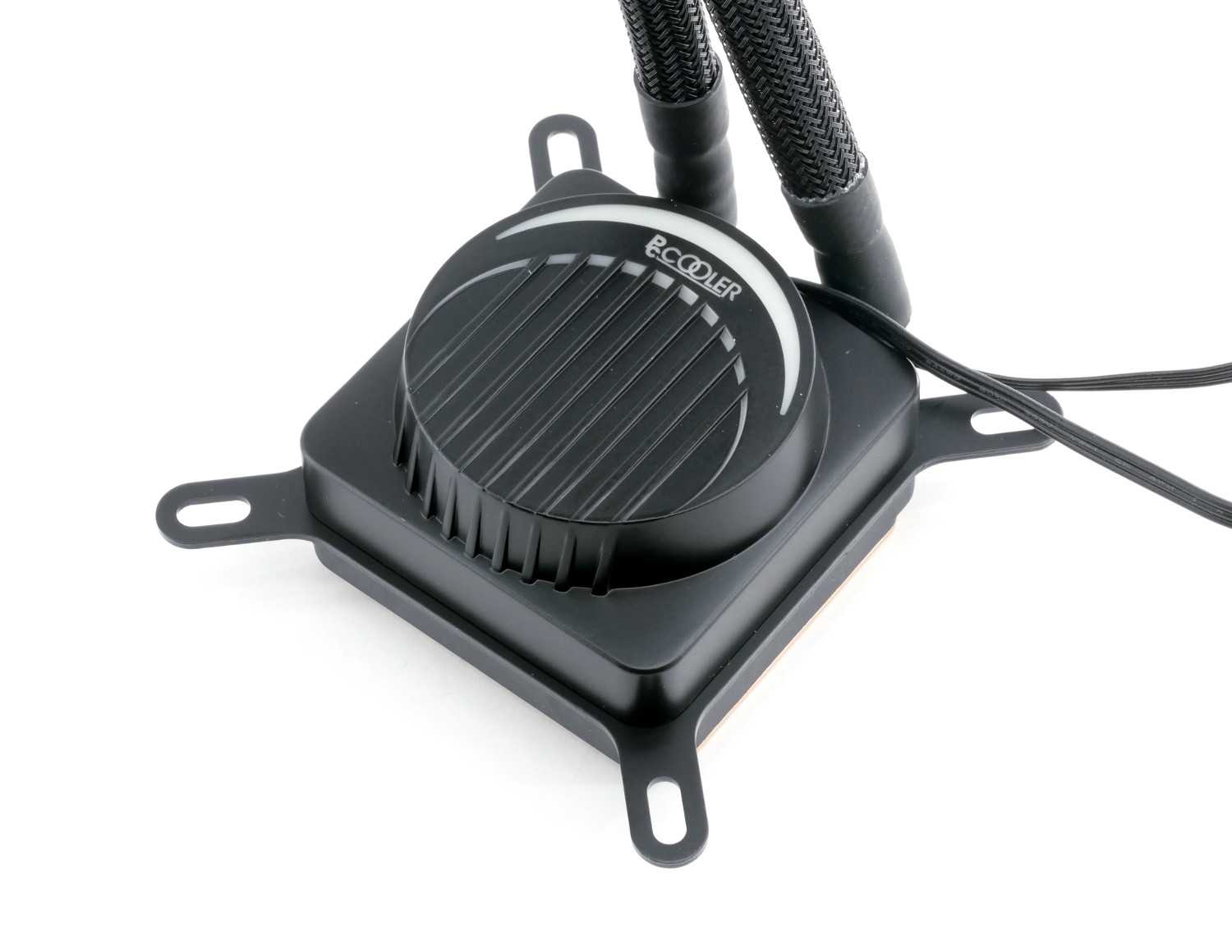 Главной отличительной особенностью жидкостных систем охлаждения под флагом PCCooler является конечно же дизайн и механизм помпы-водоблока! Это квадратная форма, плавно переходящая в усеченный конус с логотипом производителя и подсветкой, настраиваемая ПО непосредственно материнской платы или штатным внешним контроллером. Размеры остались прежними — это75 х 62 х 40 мм, как и характеристики: заявленная скорость 2600 об/мин при потреблении 5,6 Вт.