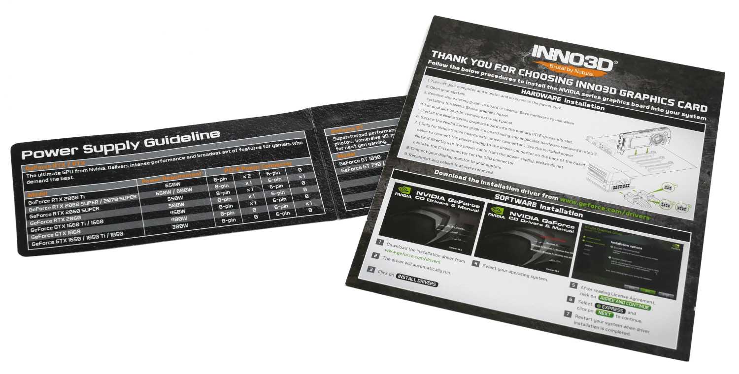 Внутри упаковки вы уже не встретите неактуальный диск с драйверами, которые пользователи самостоятельно в любом случае скачивают с сайта производителя, однако обнаружите полезное руководство и брошюру с рекомендованными мощностями блока питания.