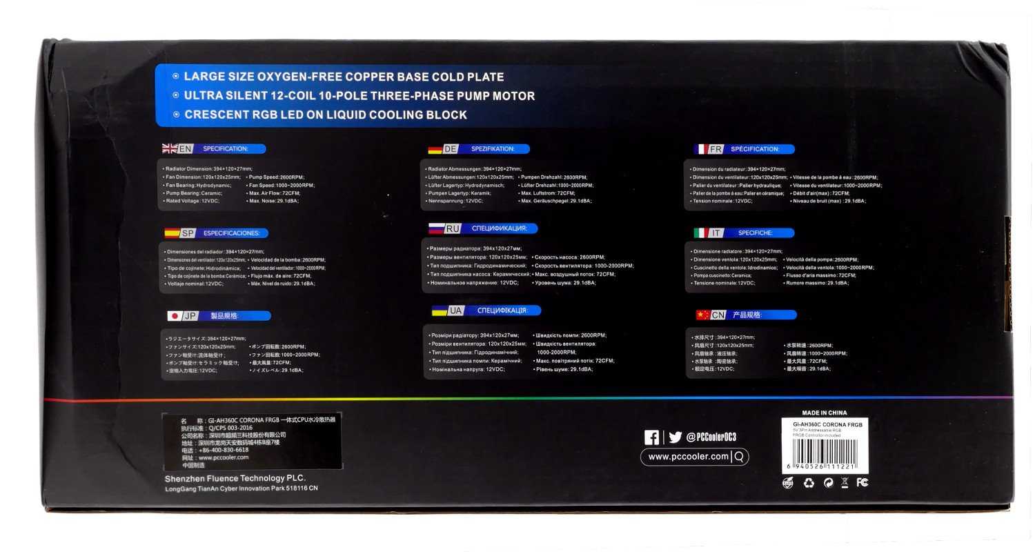 С обратной стороны коробки и по ее торцам перечислены технические характеристики СЖО с указанием габаритов, скорости вращения вентиляторов, помпы и т.д.