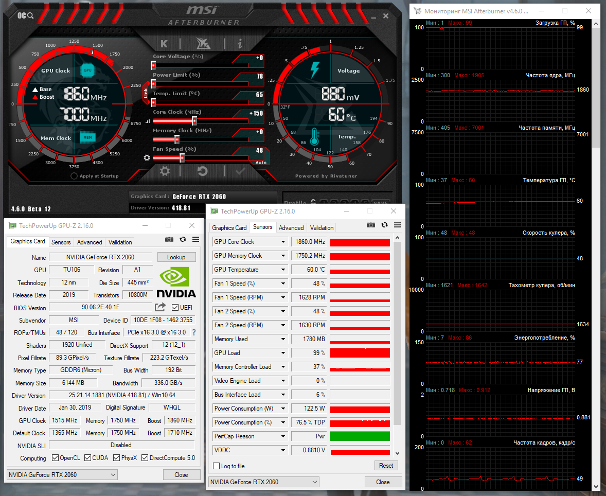 «Даунвольтинг» позволяет оптимизировать возможности MSI GeForce RTX 2060 Ventus 6G OC: при Power Limit = 78%, вентиляторах 48% и частоте ядра + 150 МГц, видеокарта прогревается до 60*С по чипу и 67*С по подсистеме питания при схожей производительности и уровне шума.