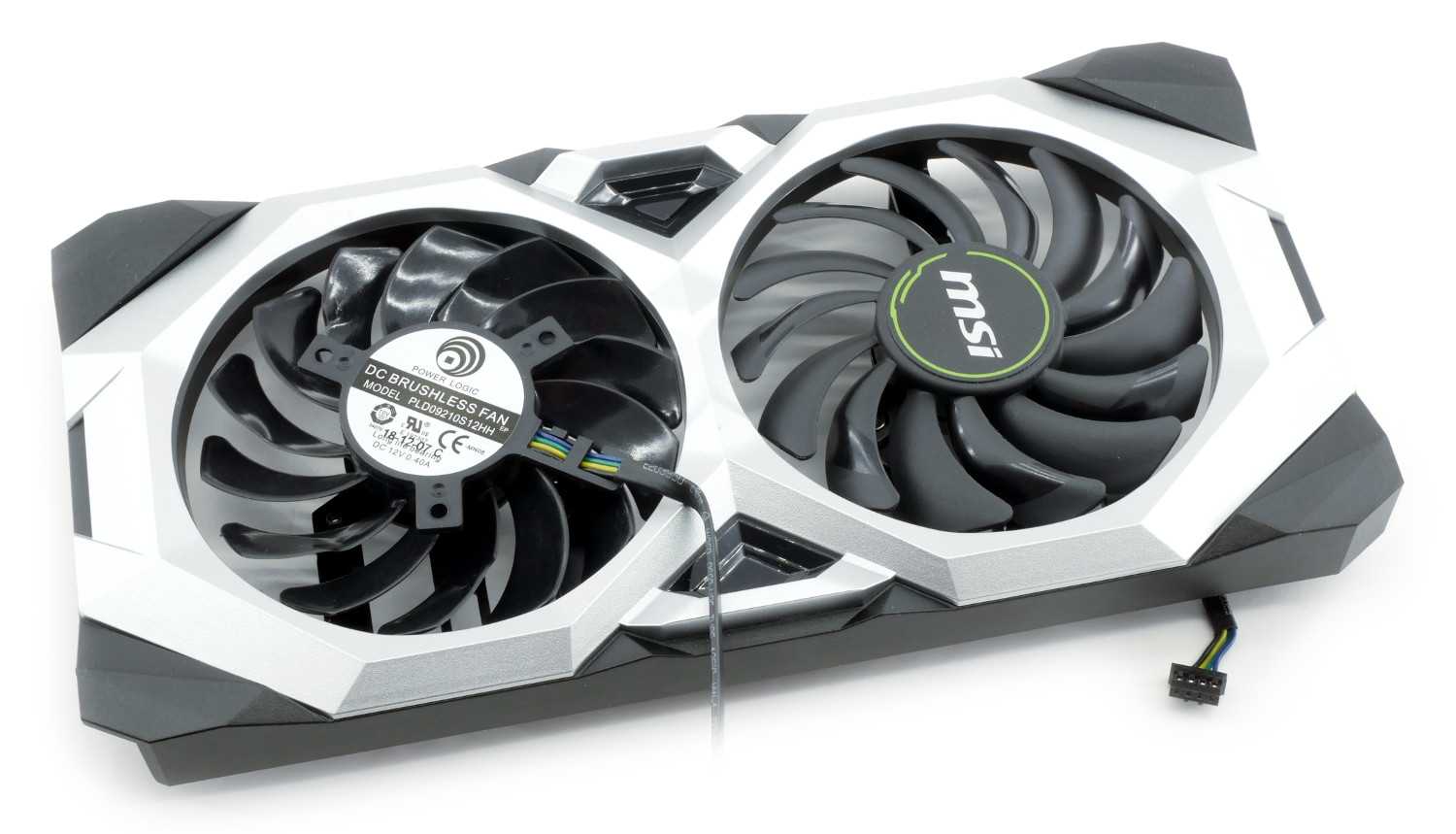 Вентиляторы PLD09210S12HH изготовлены компанией Power Logic — популярным партнером среди разработчиков. Скорость регулируется в диапазоне от 800 об/мин до 3500 об/мин. Технология Zero Frozr не поддерживается: карлсоны в простое не останавливаются. Однако пользователь может прошить BIOS от старшей модели MSI GeForce RTX 2060 Gaming Z 6G и получить желаемую функцию.