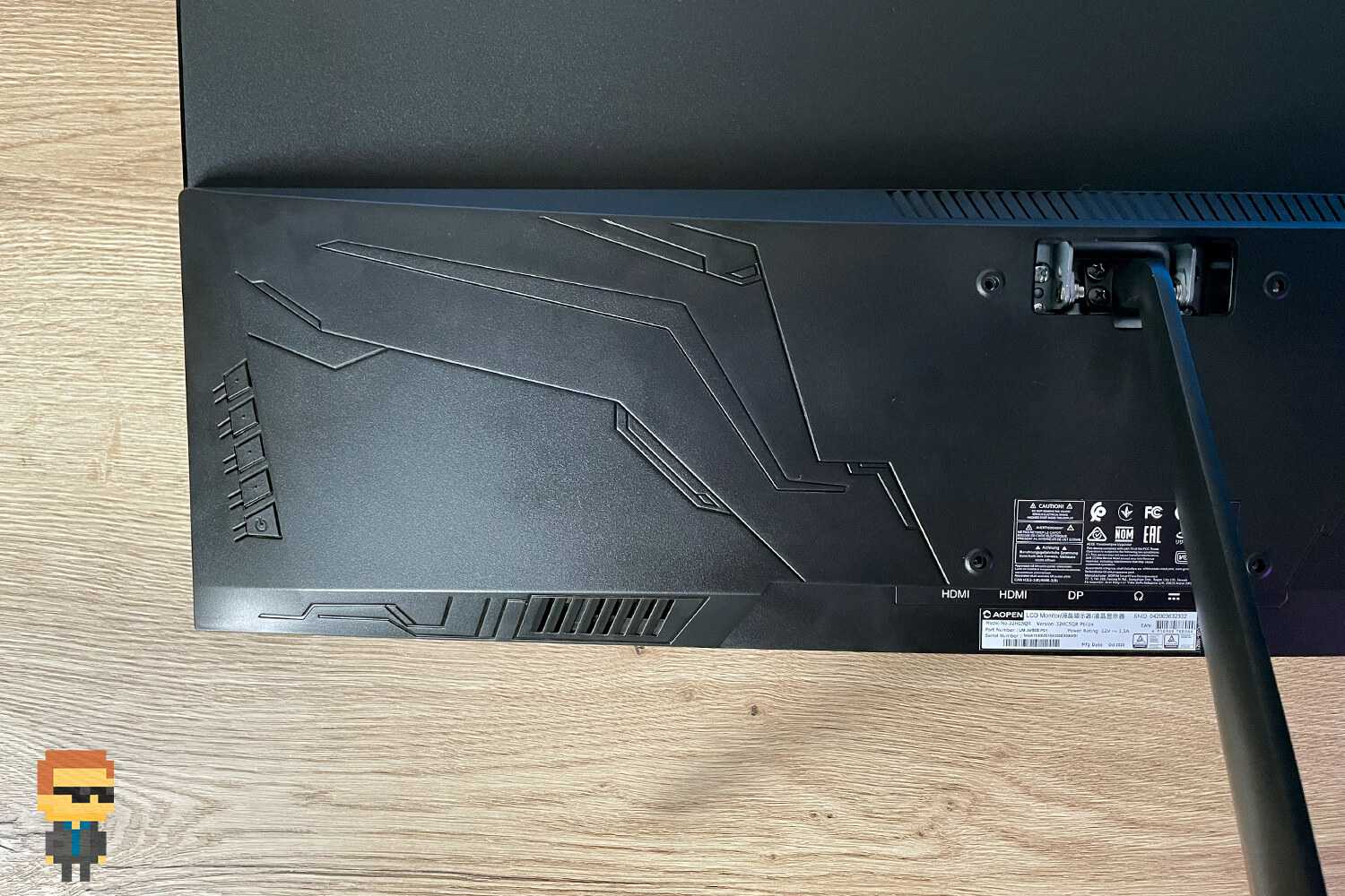 Предусмотрена также возможность крепления на стену. Нижняя часть задней панели монитора украшена оттиском в пластике. Намекает на игровую направленность дисплея, но не чрезмерно. Благодаря этому и общему дизайну модели может использоваться и в офисе.