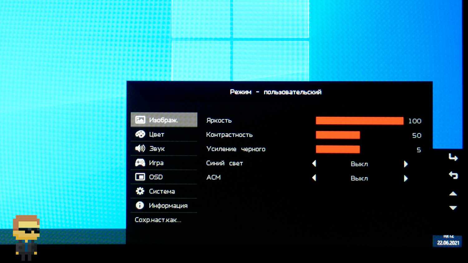 Первый пункт «Изображение». Позволяет установить значения яркости, контрастности. Кроме того, предусмотрены усиление черного, включение и выключение синего света и ACM.