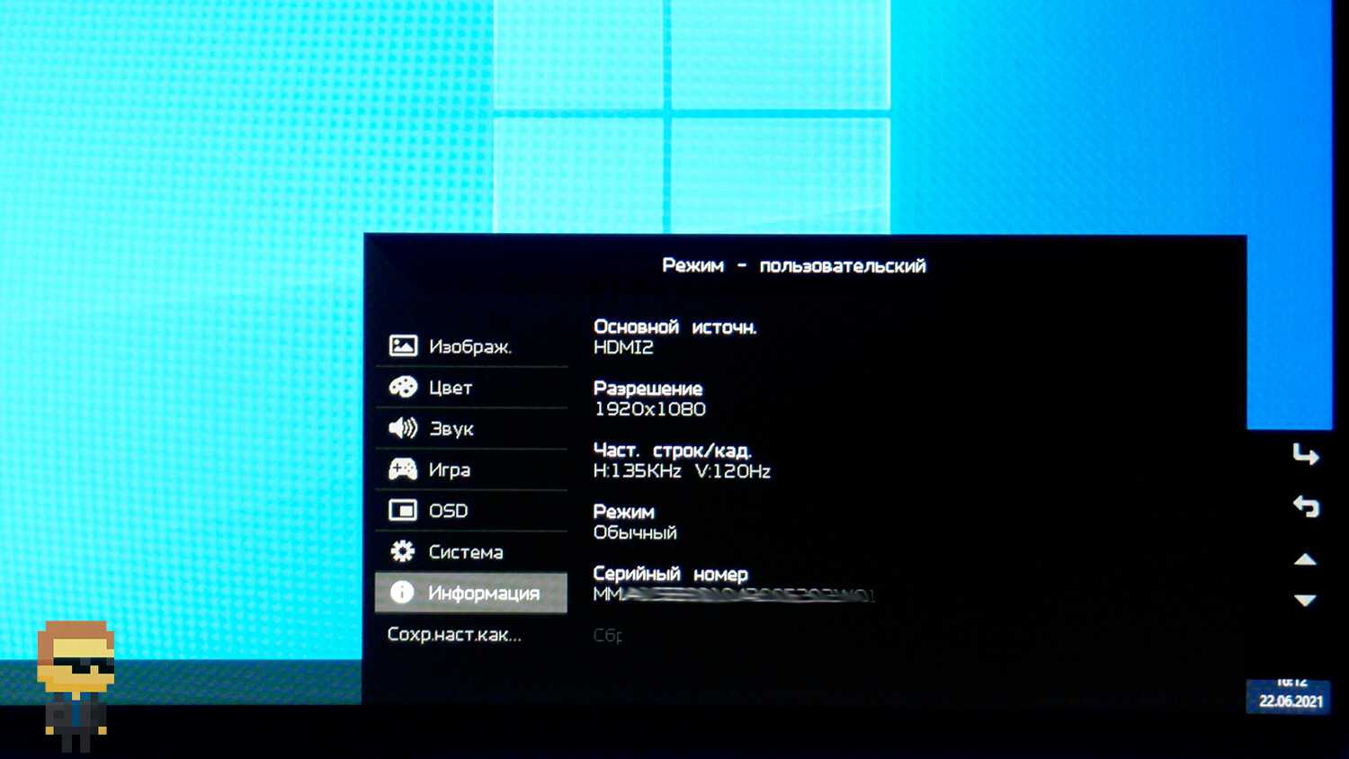 В седьмом пункте «Информация» собраны основные сведения о работе монитора. В том числе указаны: основной источник изображения, разрешение в пикселях и частота. Показан серийный номер монитора, а также режим работы. Нижний подпункт — сброс настроек к исходным.
