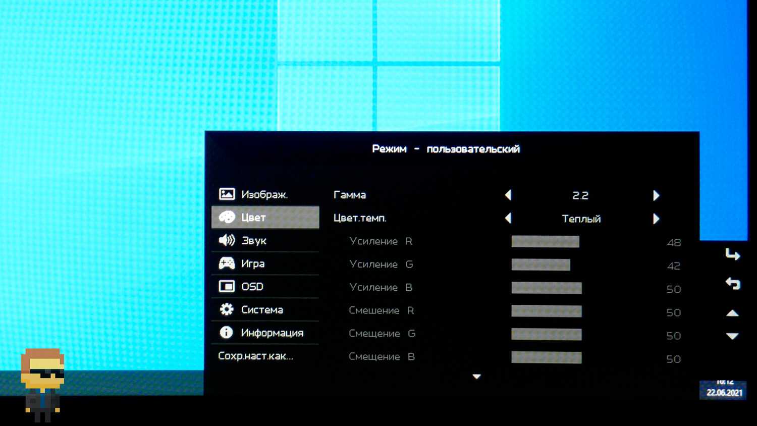 Второй пункт «Цвет». Можно задать гамму и в ходе тестирования соответствие установленного значения реальному подтвердилось. Предусмотрено усиление и смещение цветов R, G, B. Там же выбирается цветовая температура.